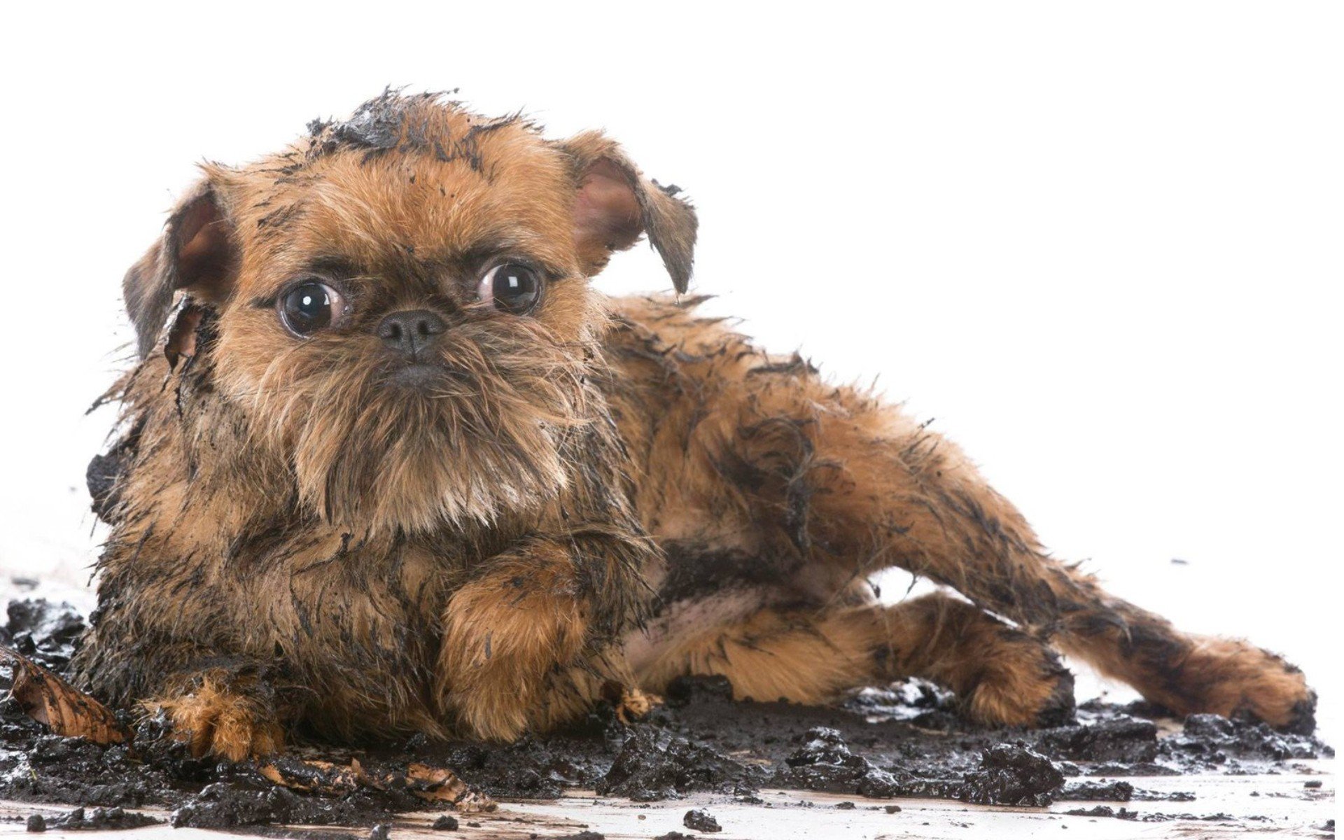 Грязная собака на белом фоне