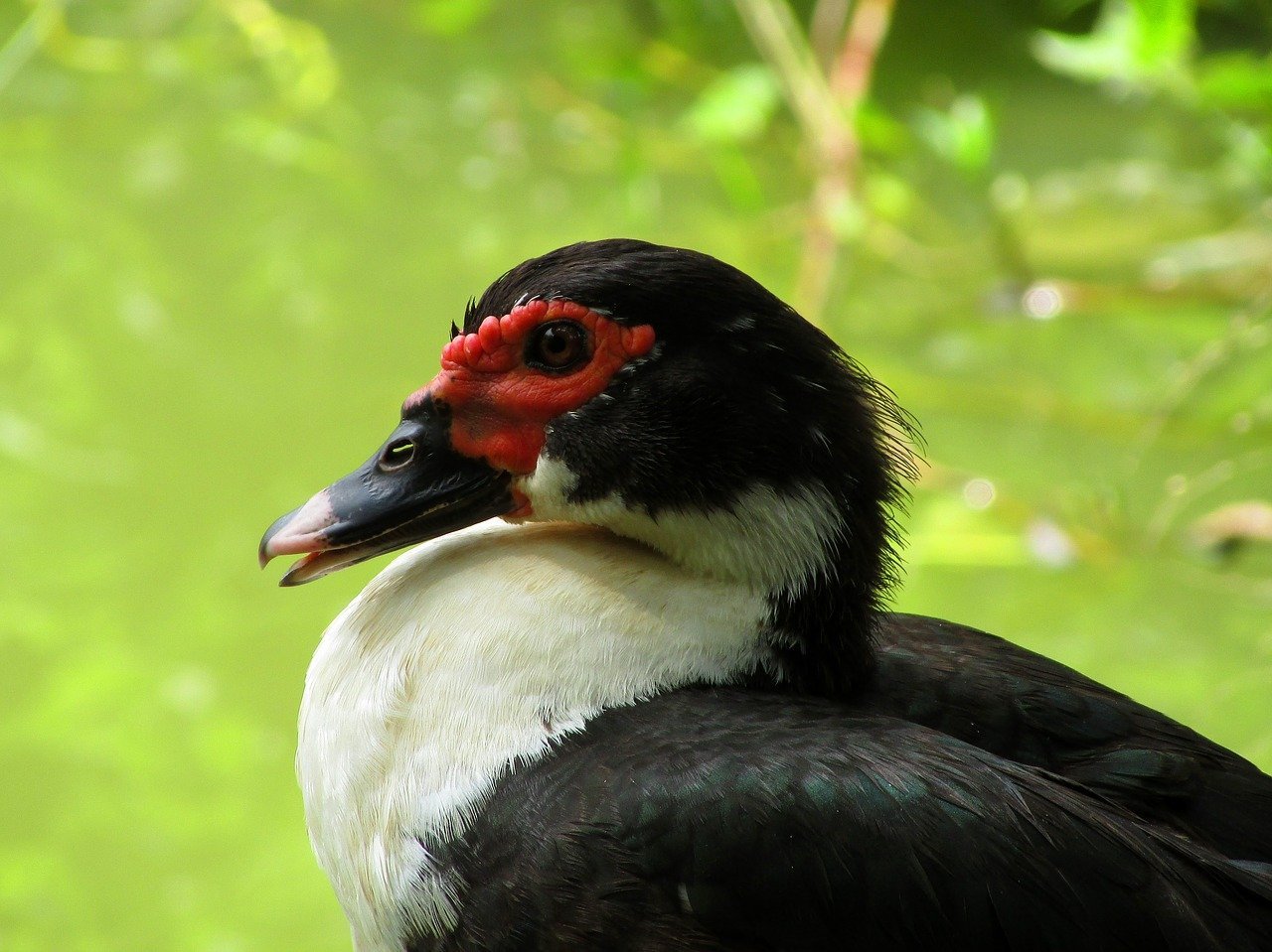 Утка с красными глазами и черным клювом