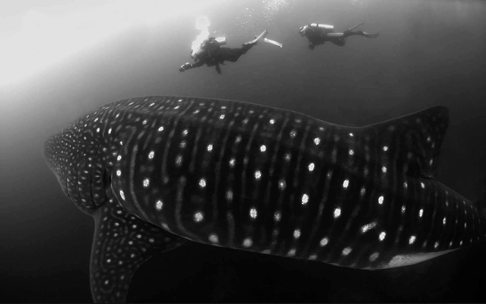 Черно белый снимок кита в океане