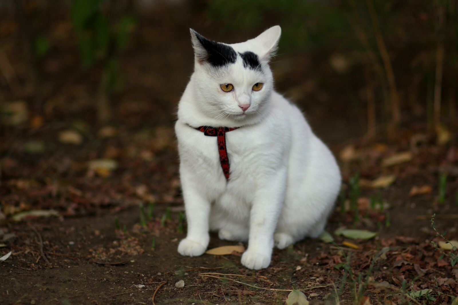 Черно-белая кошка в лесу