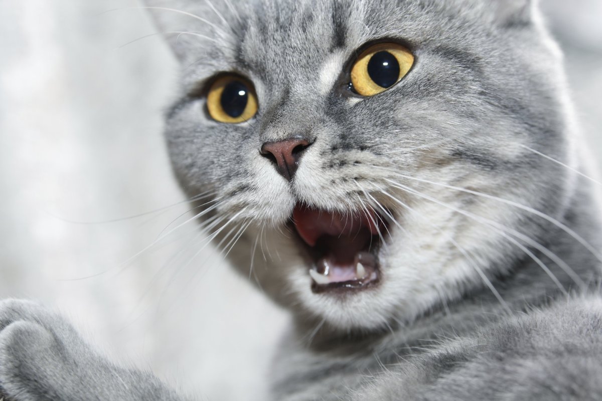 Серая кошка с открытой пастью