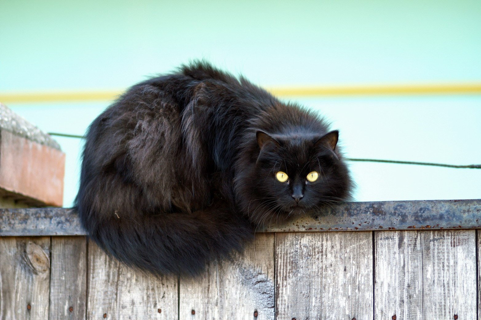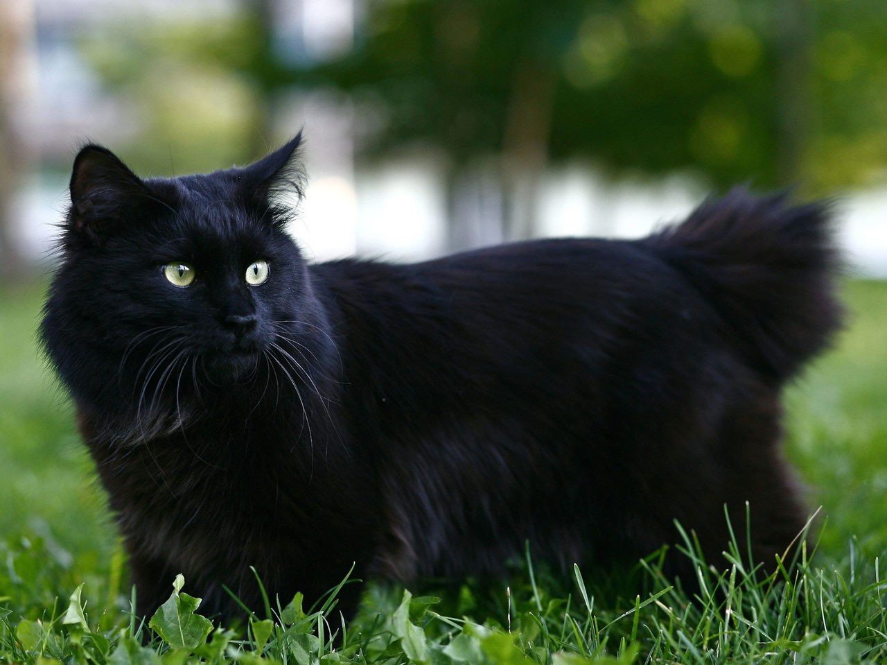 Черный пушистый кот на улице