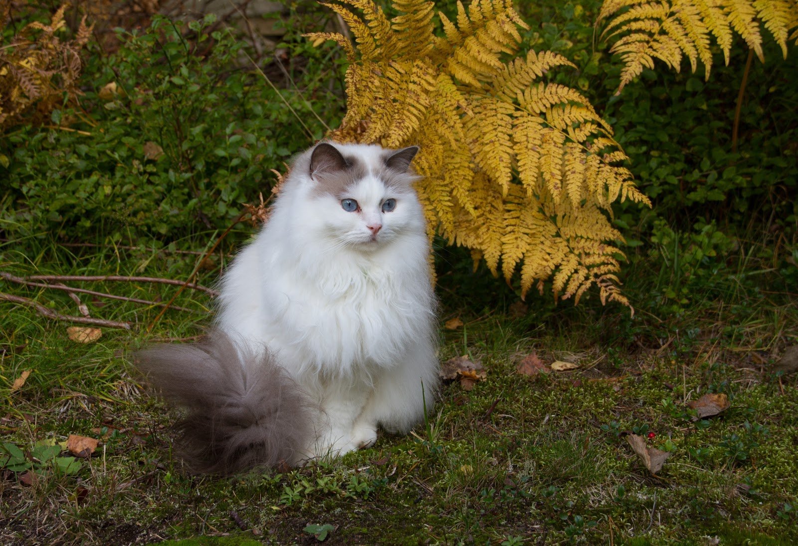 Кошка молочного цвета в лесу