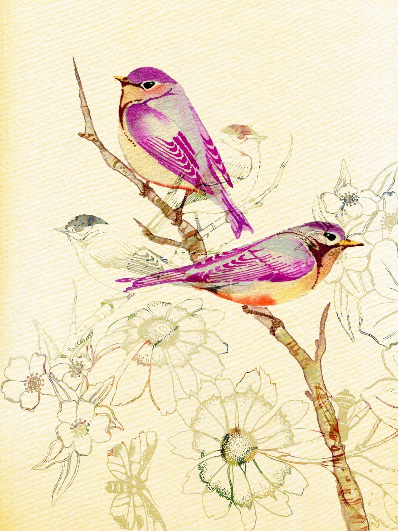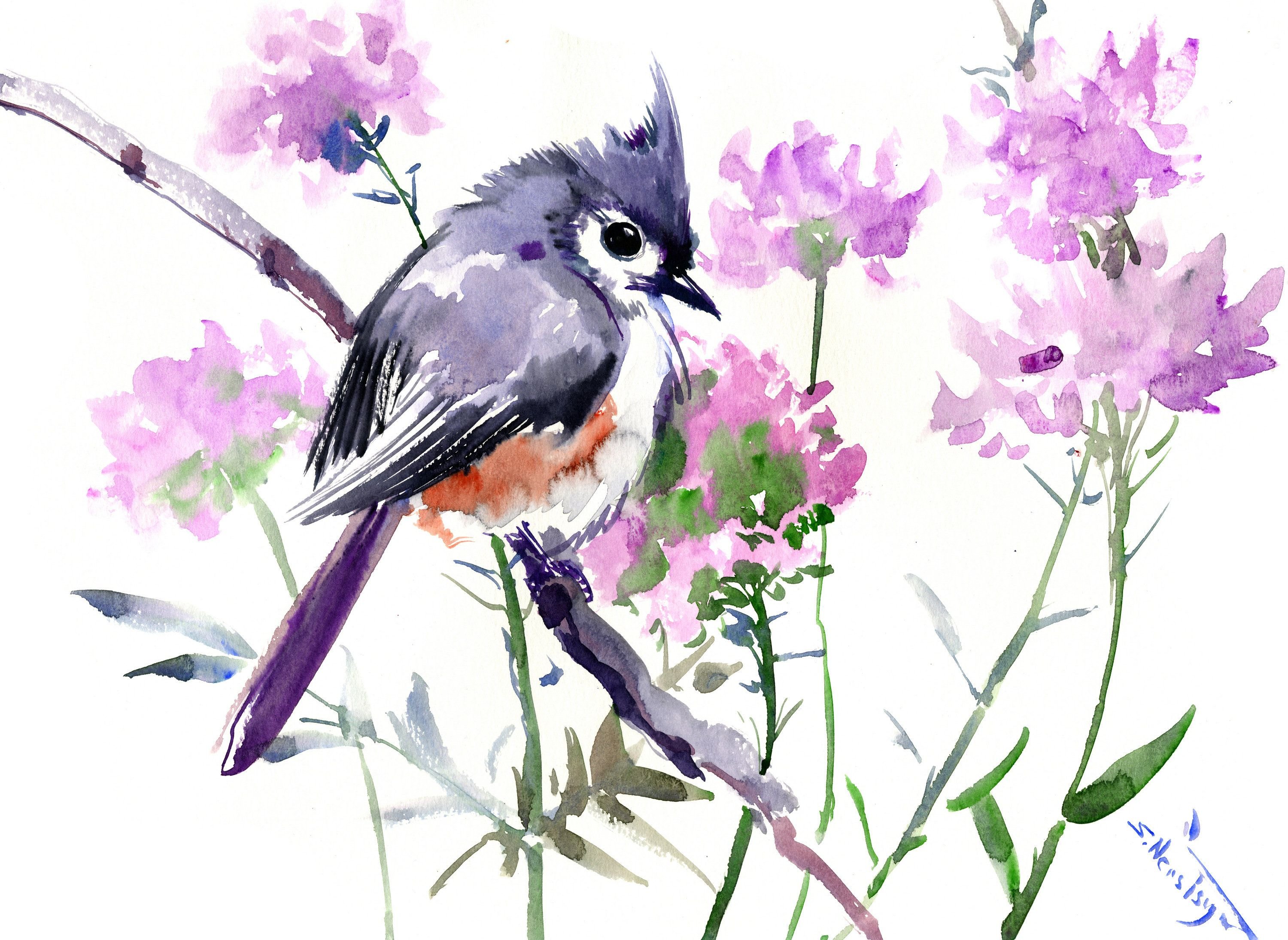 Цветы птицы акварелью