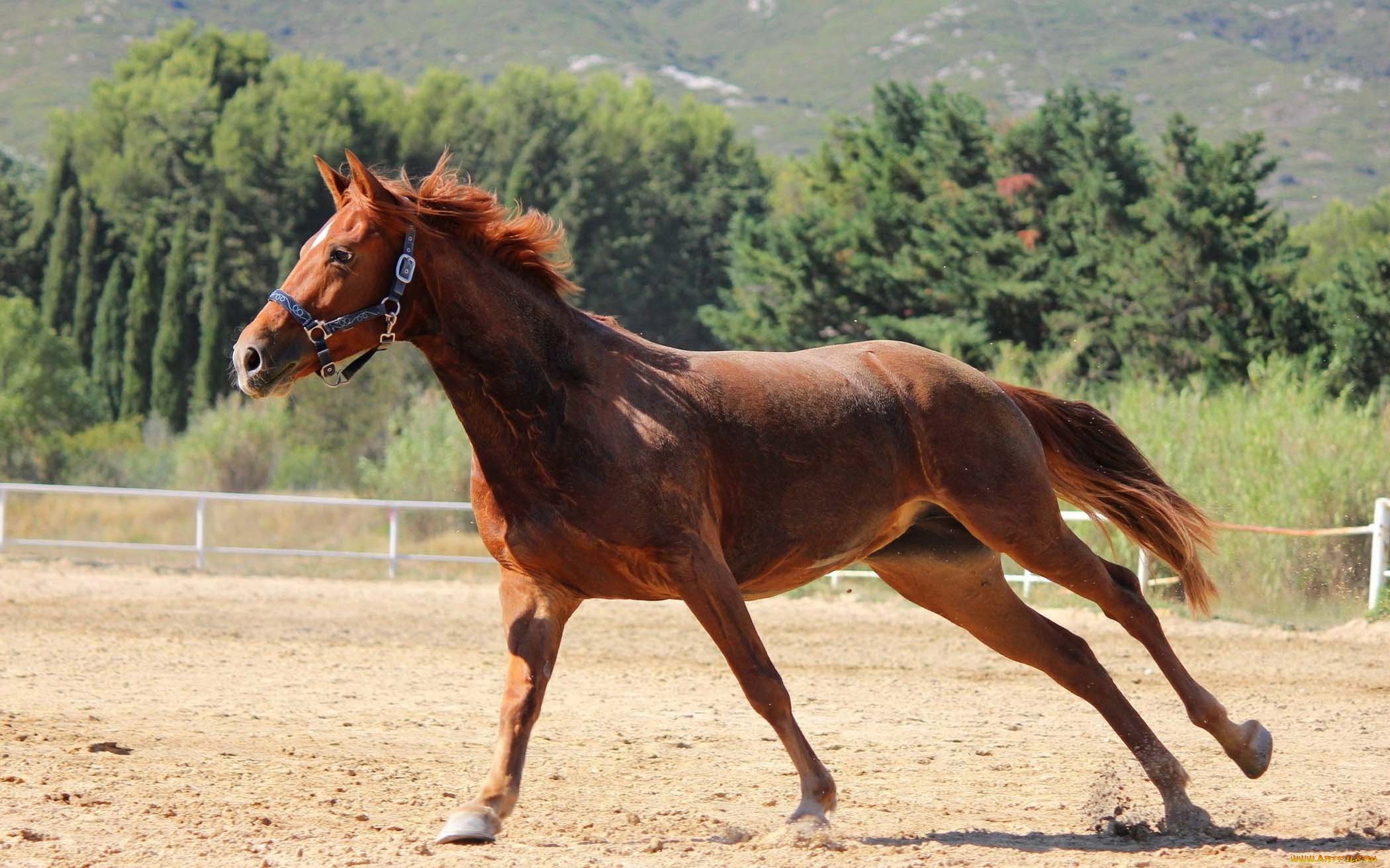 Гнедая лошадь в галопе