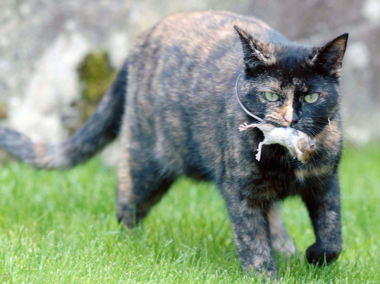 Кошка с добычей в зубах