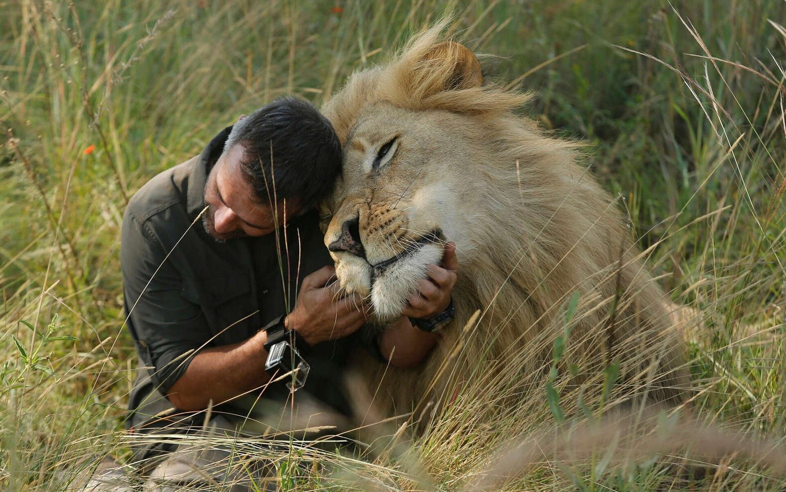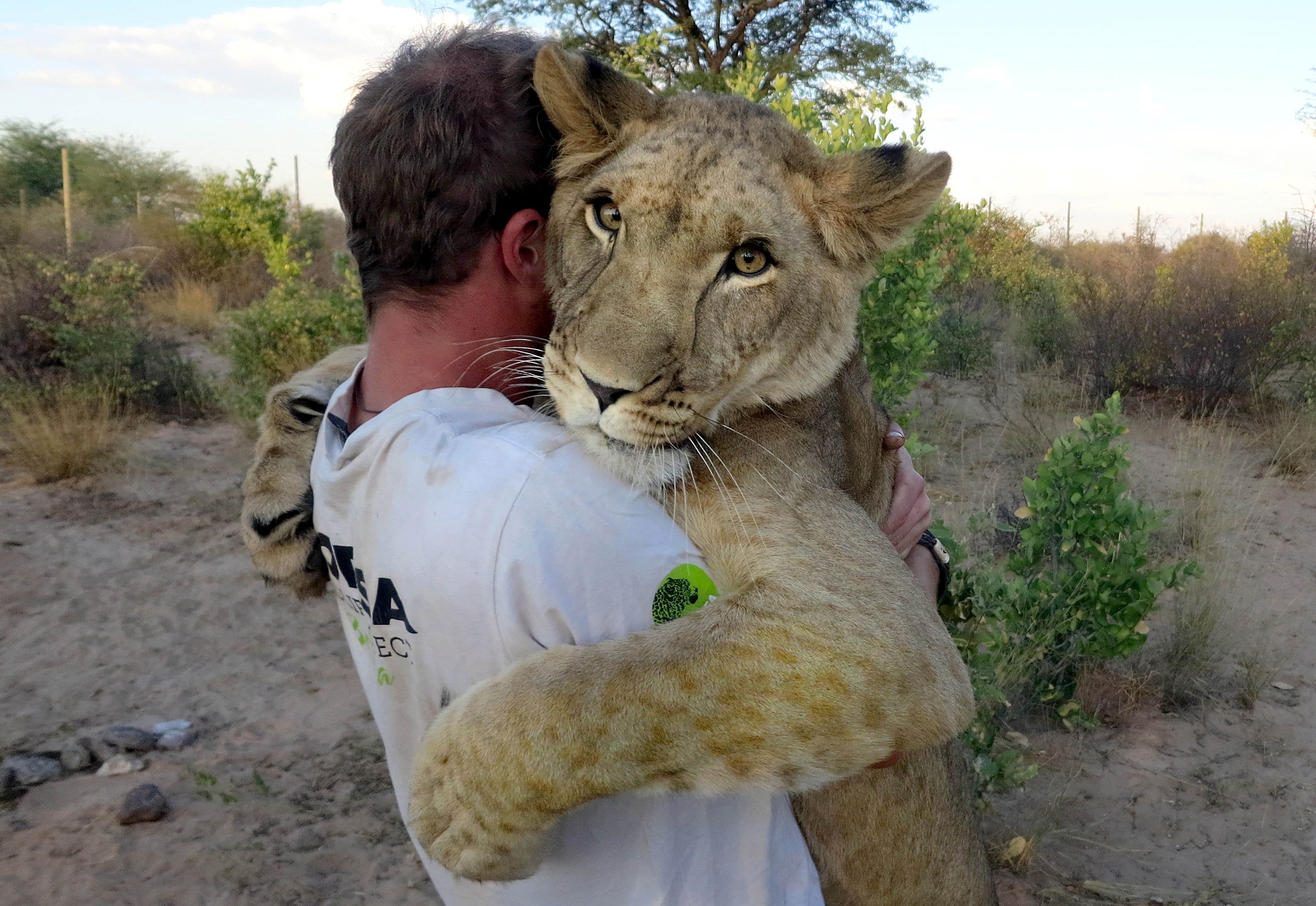 Львица обнимает человека