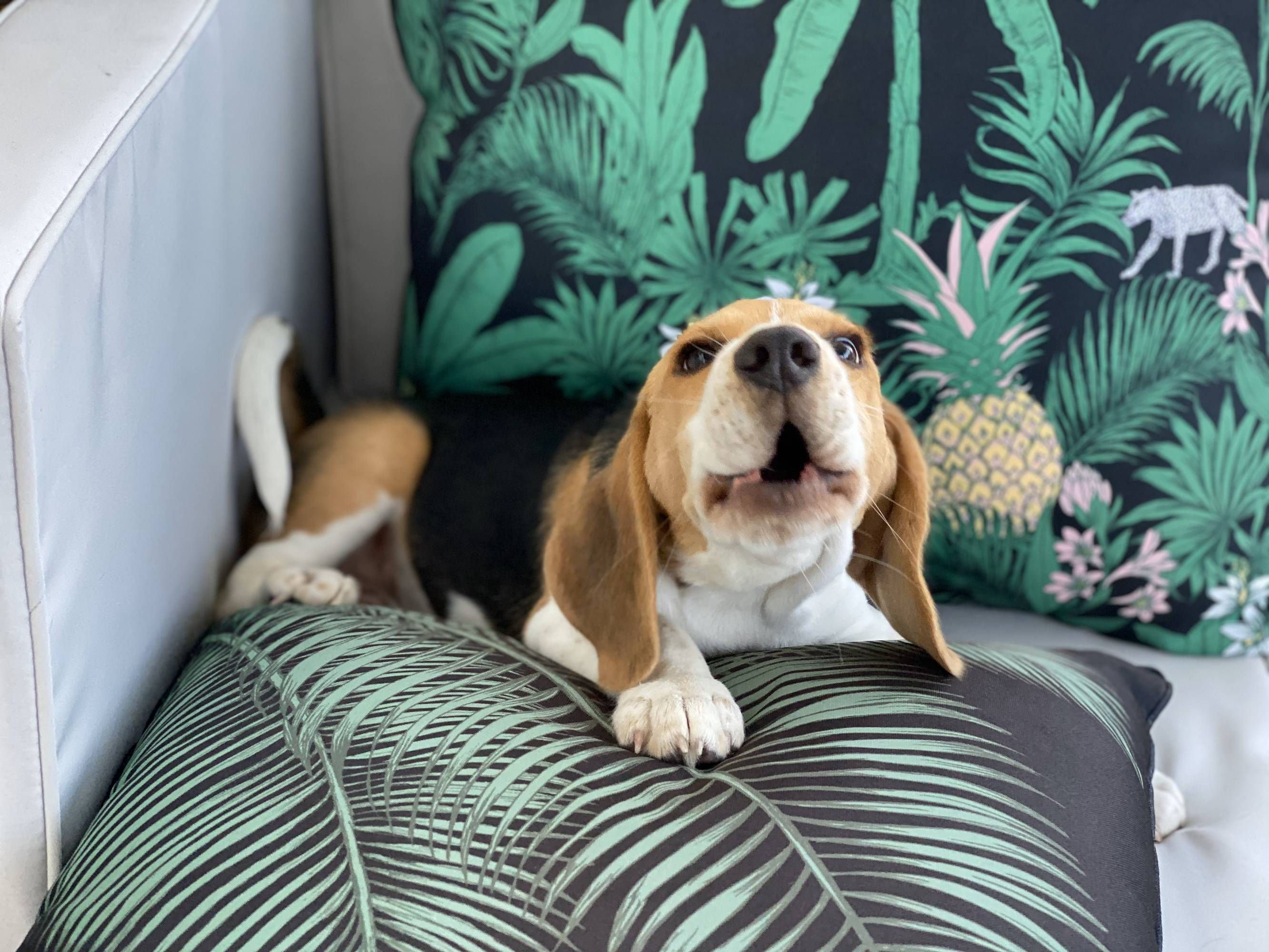 Бигль сидящий на кресле
