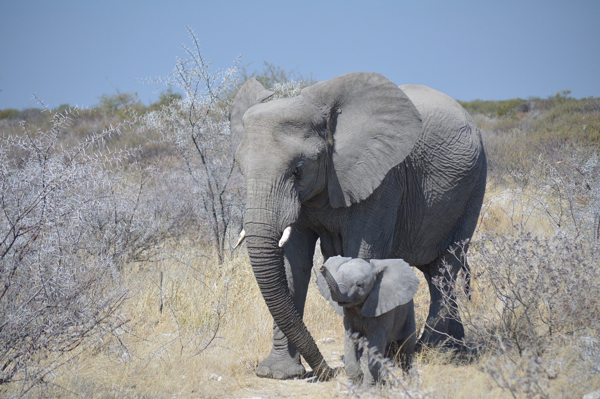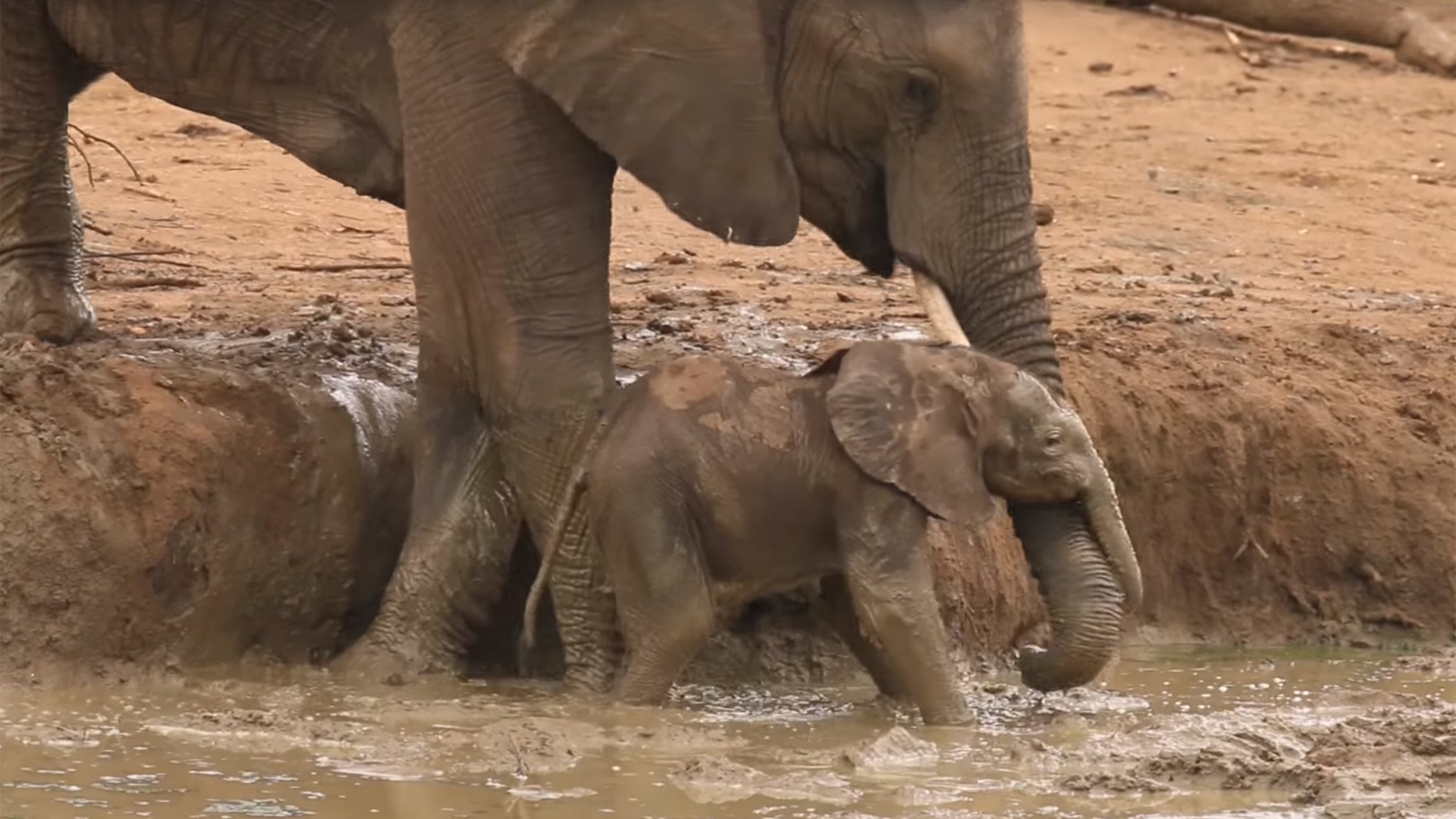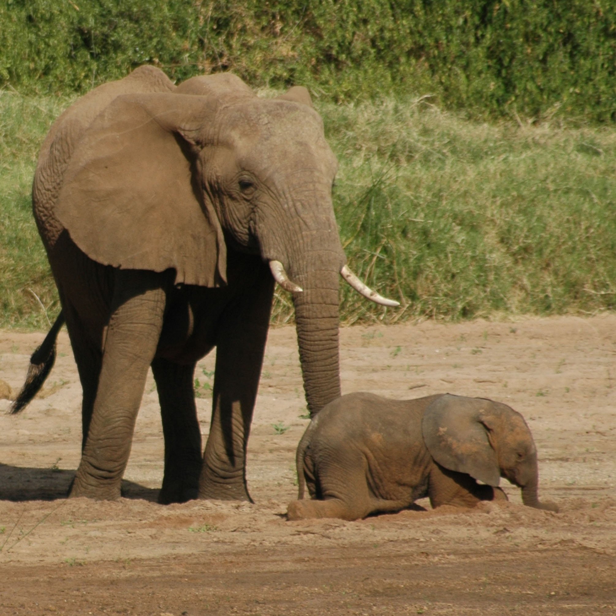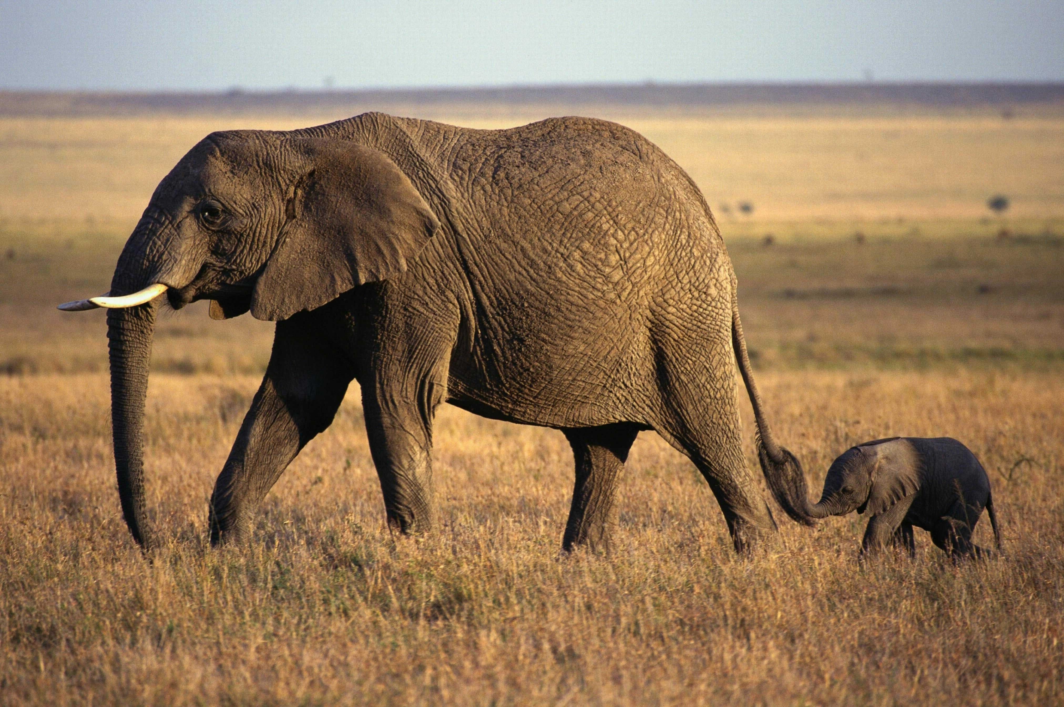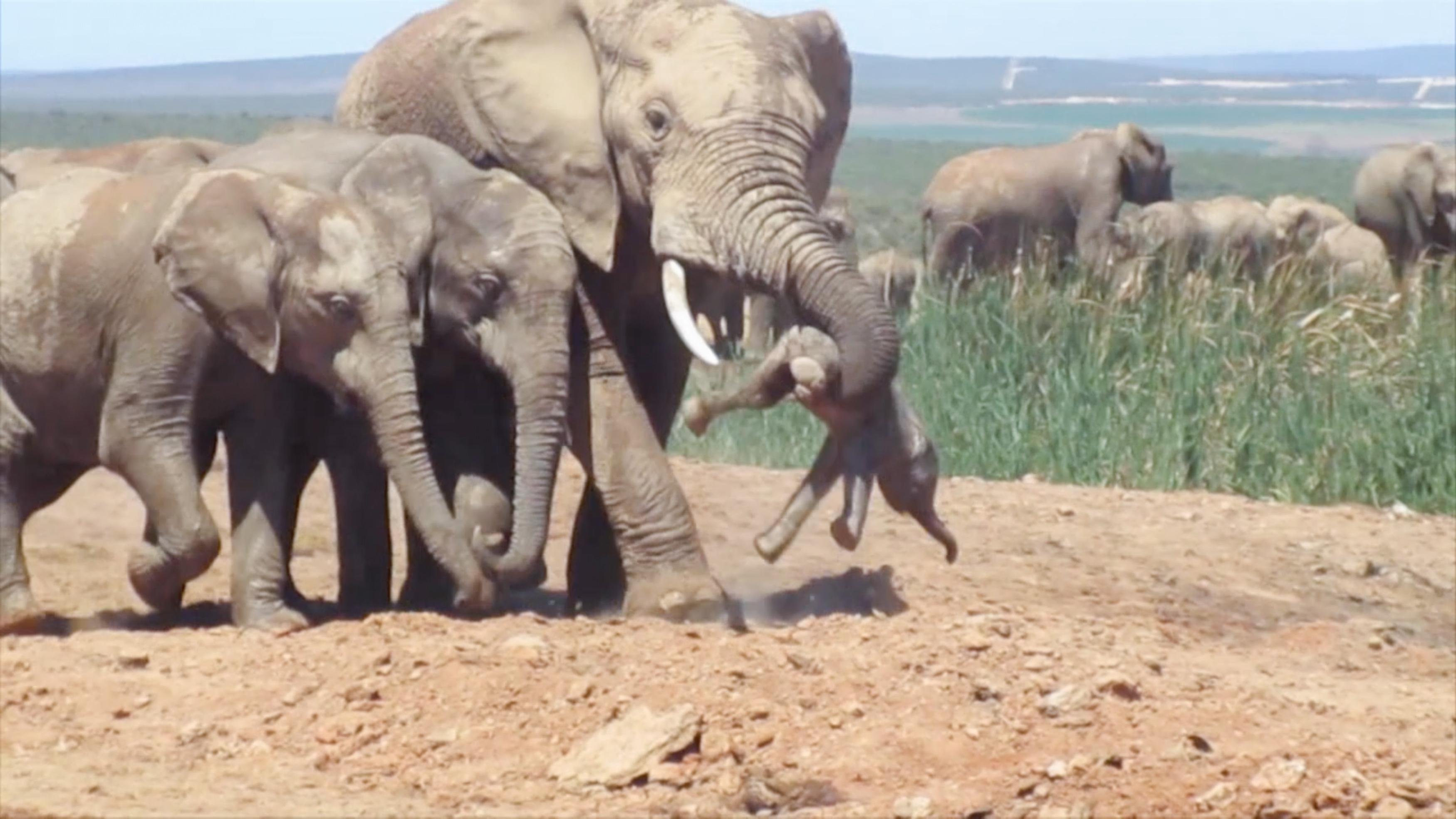 Слоненок держит маму за хвостик