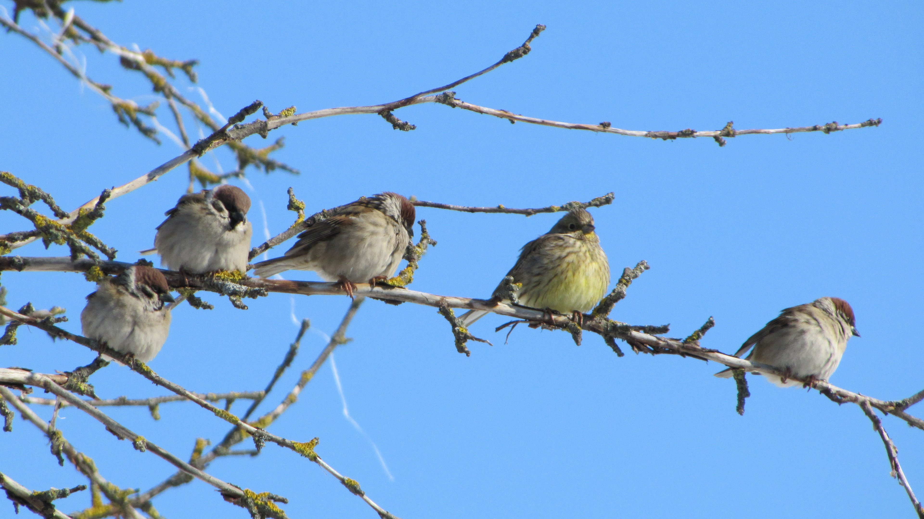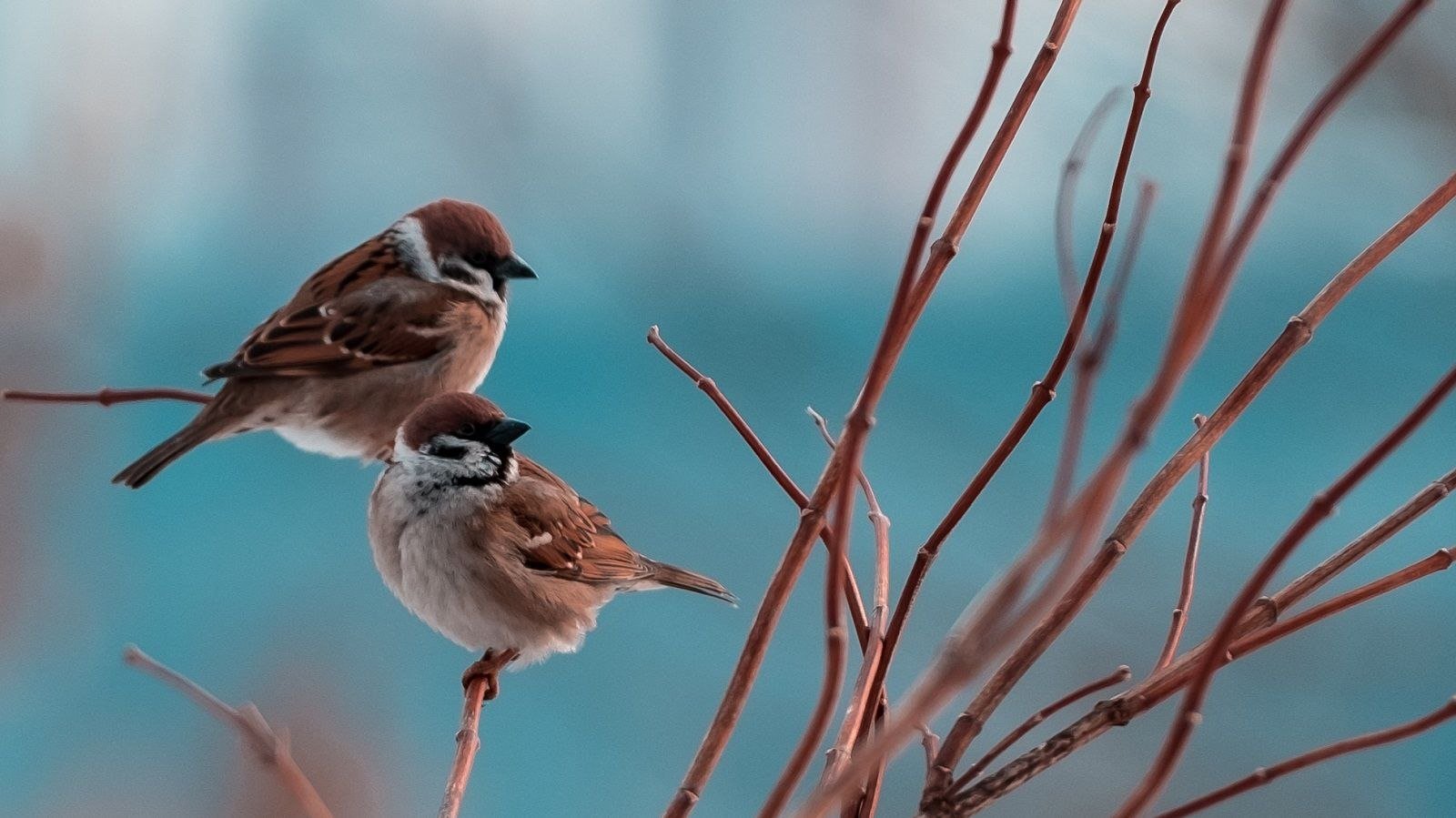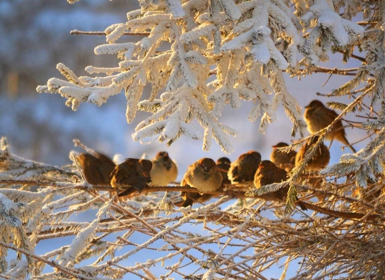 Воробьи на ветке зимой