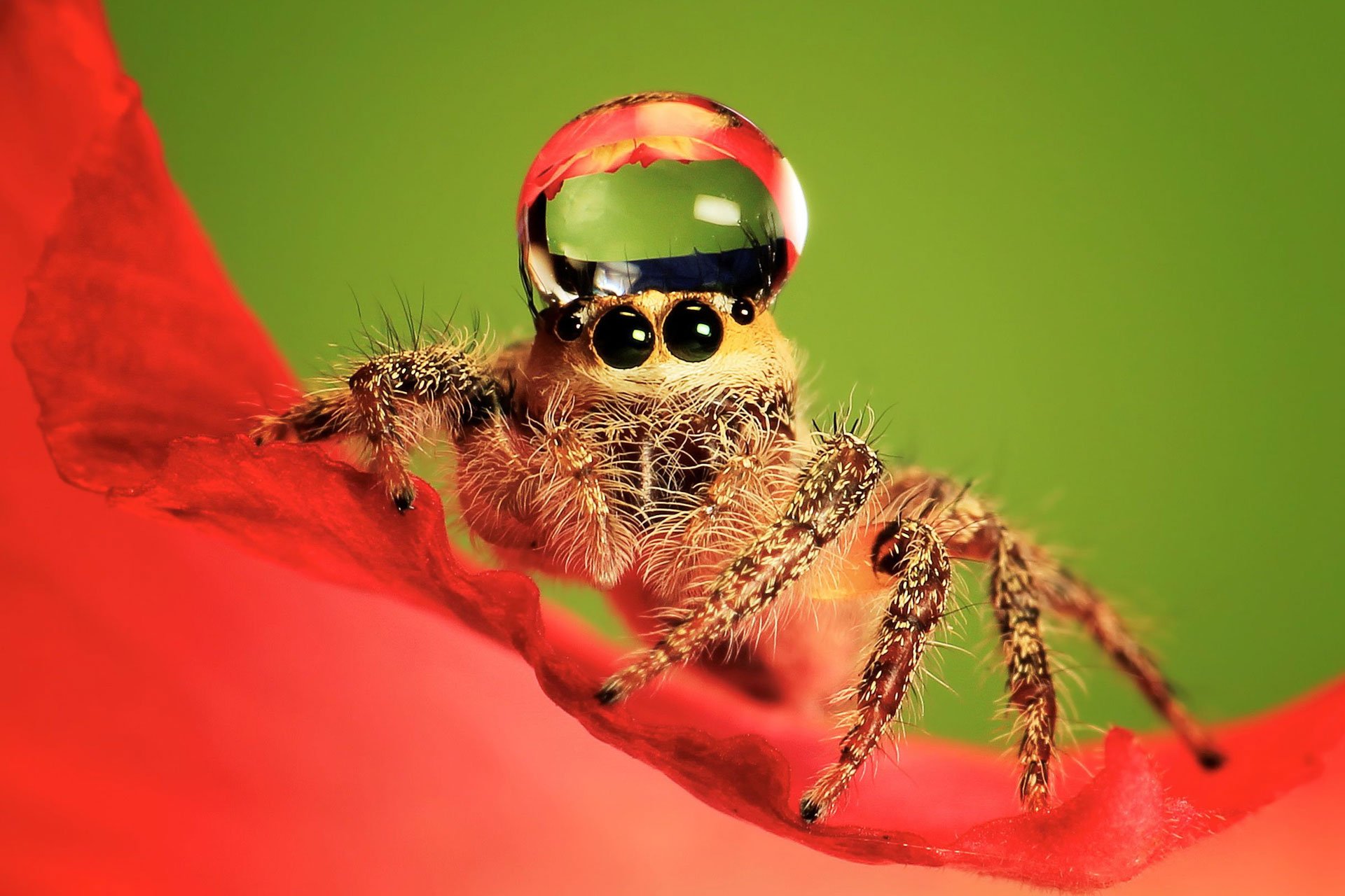 Паук скакунчик с каплей на голове