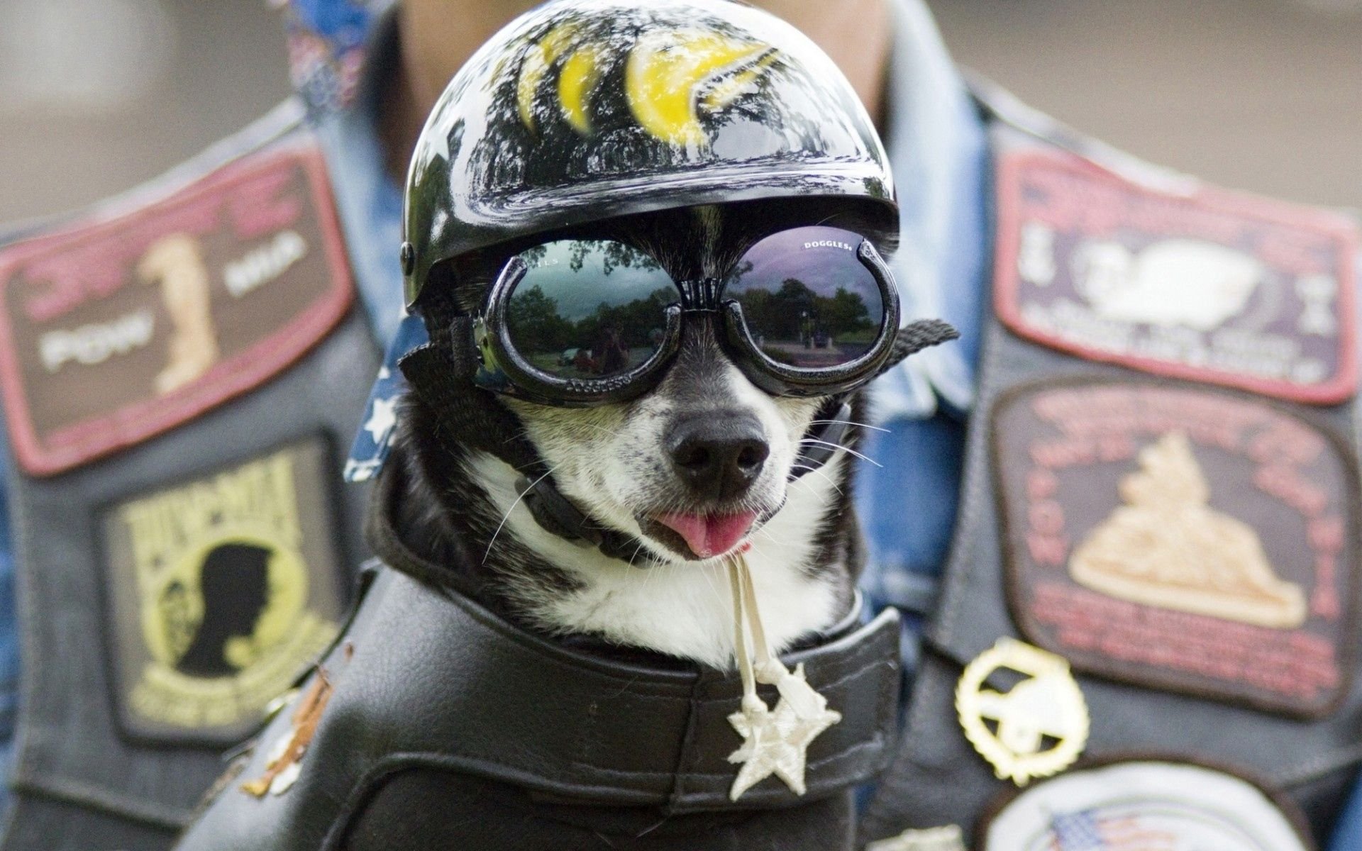 Собака в байкерском шлеме