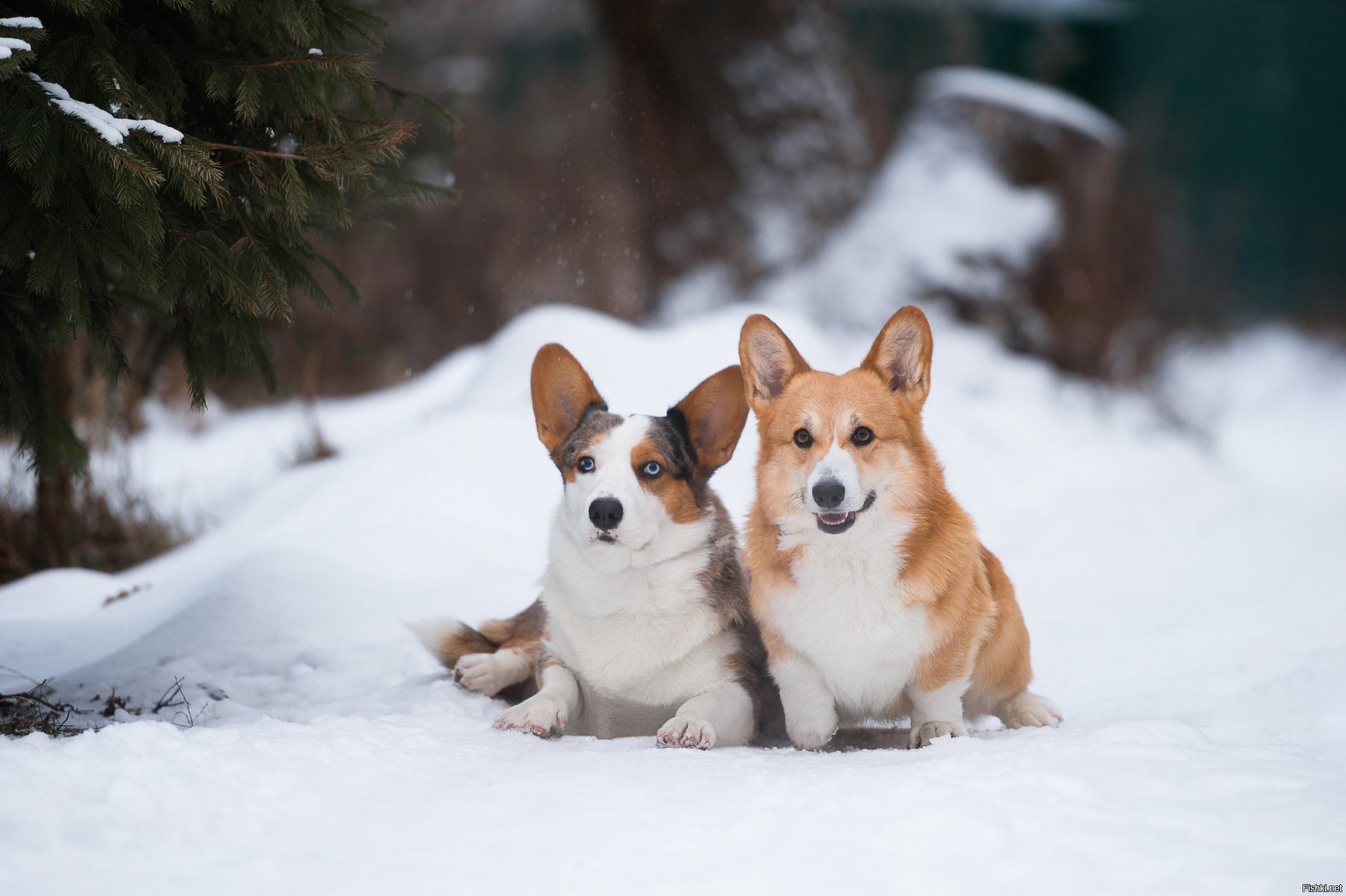 Корги зимой в лесу