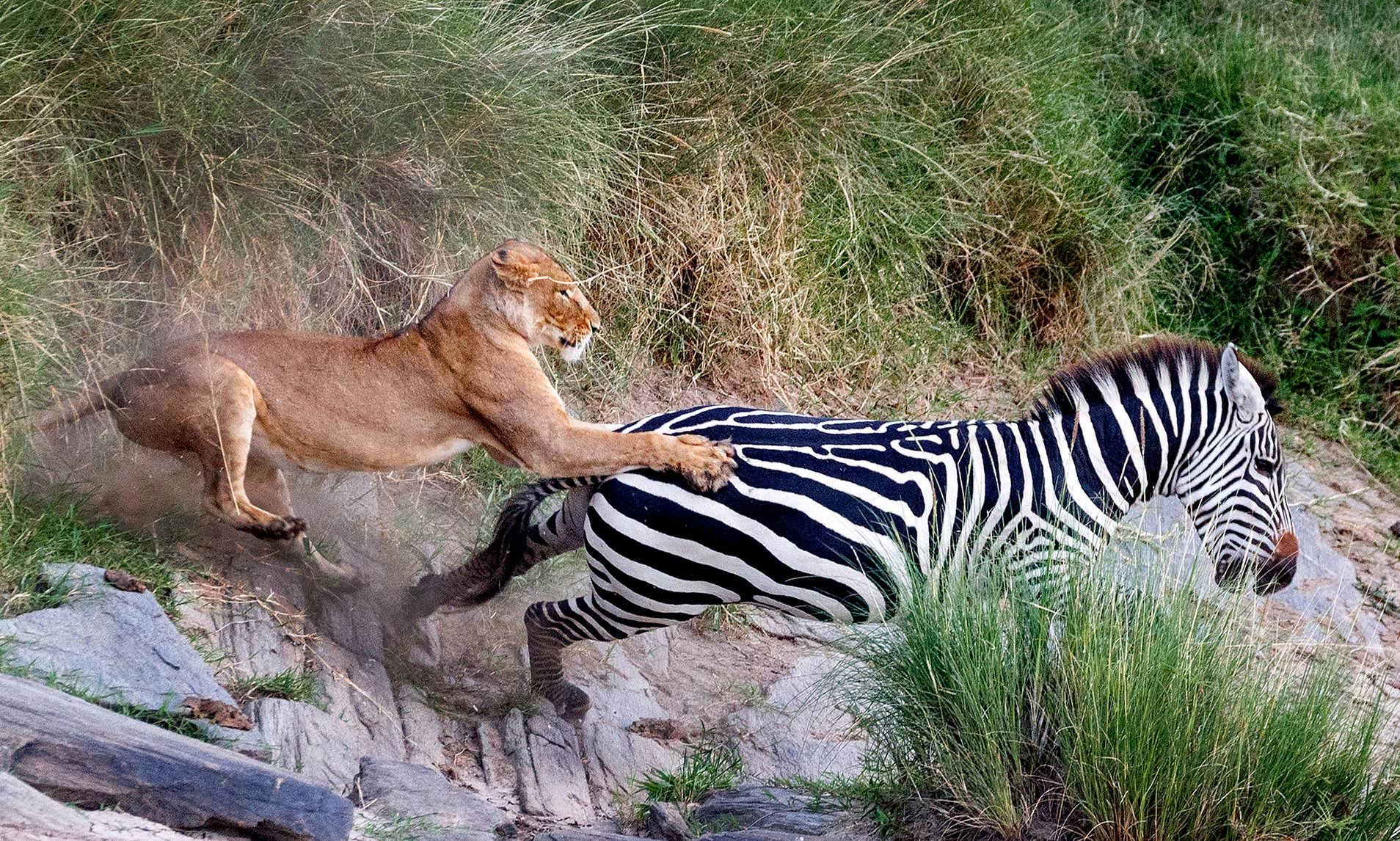 Лев охотится на зебру