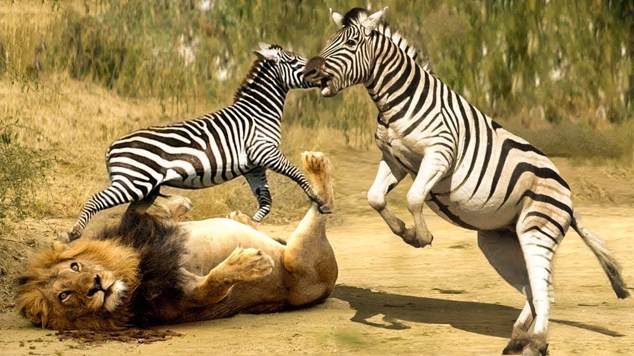 Зебра бьет Льва копытами