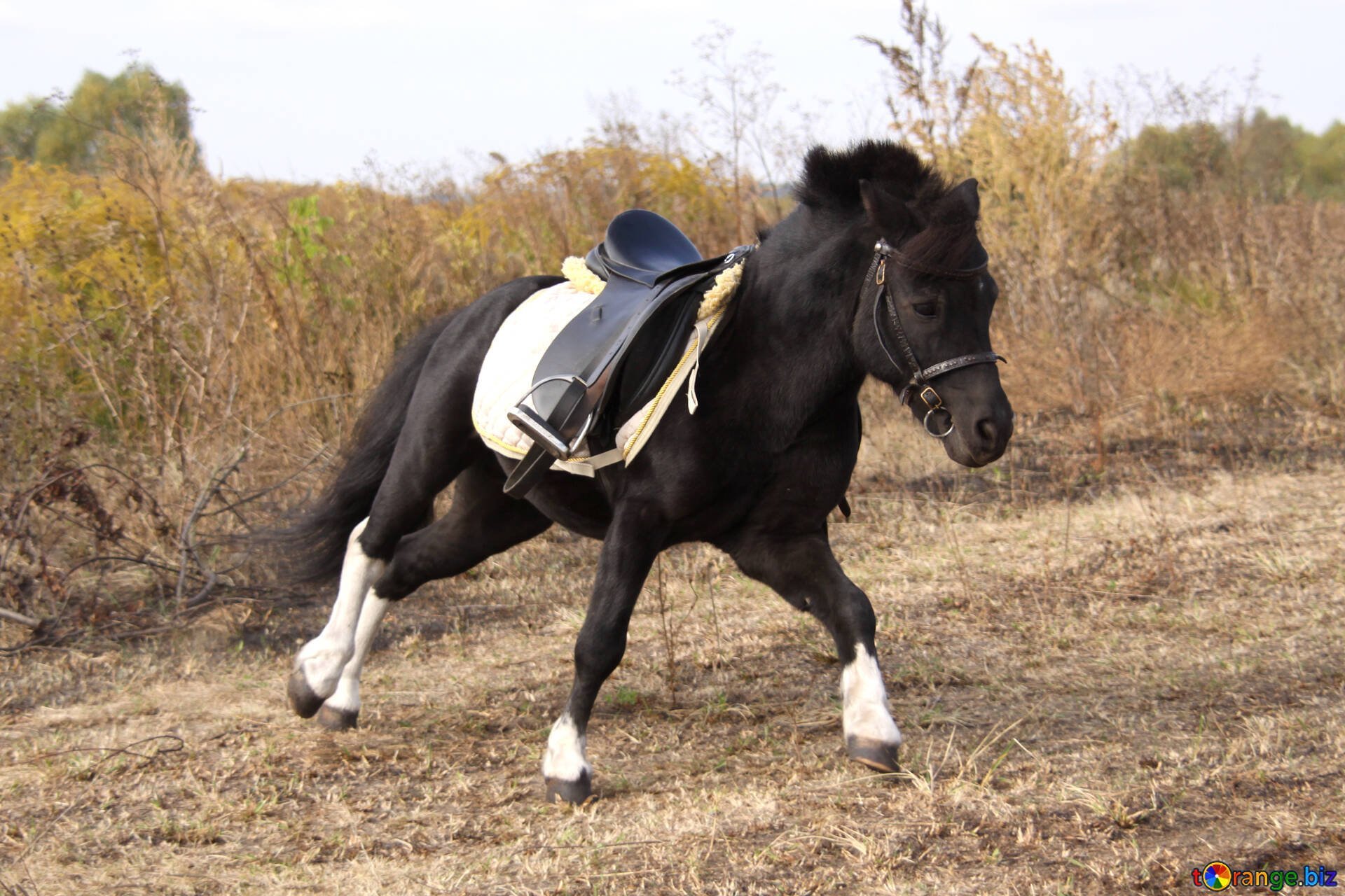 Лошадь с уздечкой и седлом