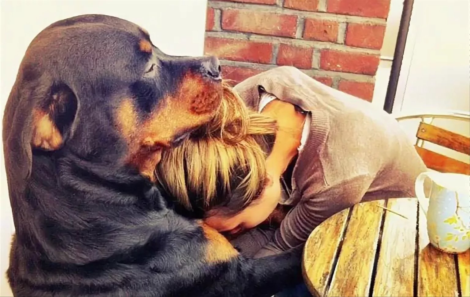 Обнимает собаку