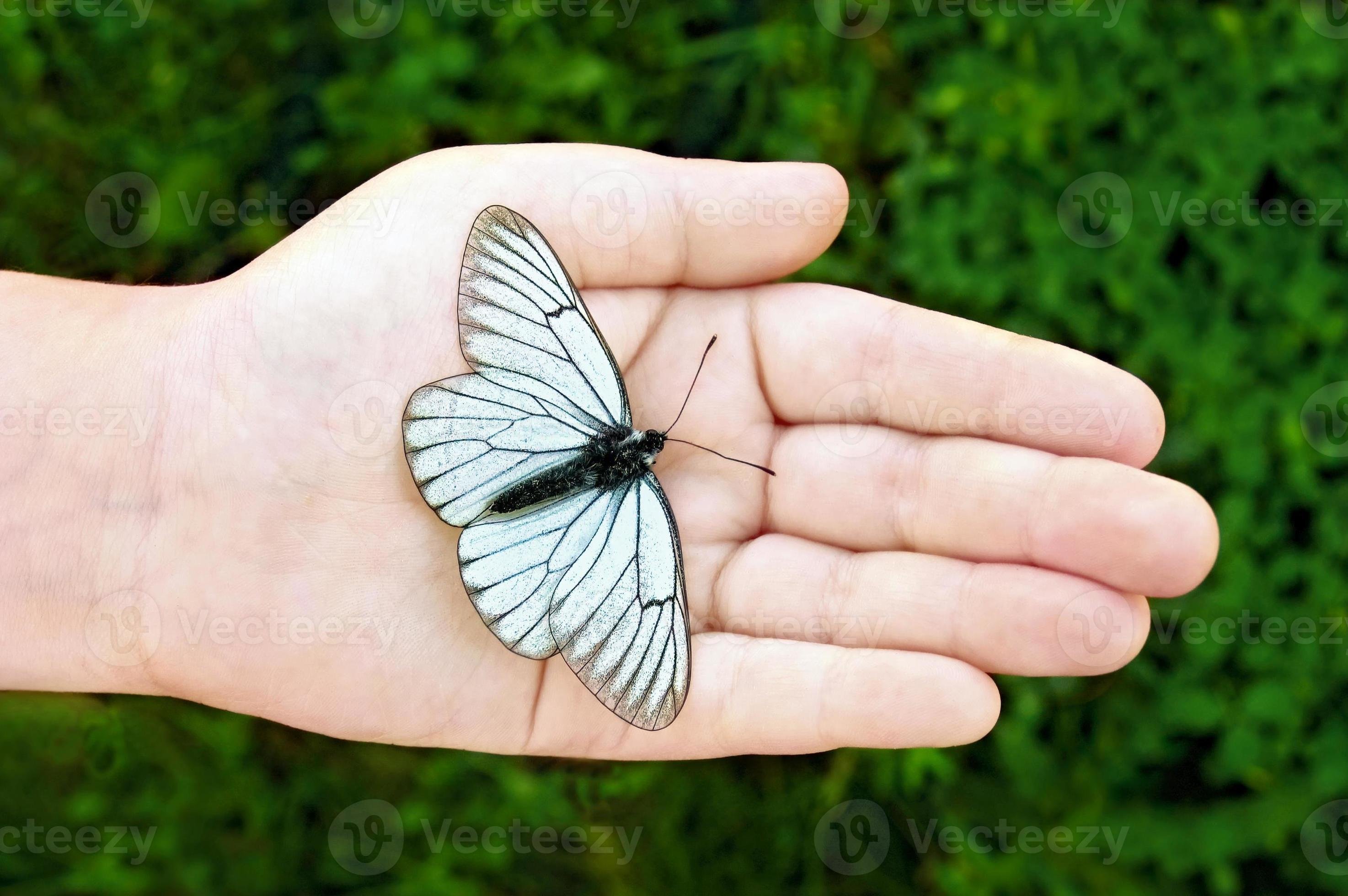 Белая бабочка сидит на руке