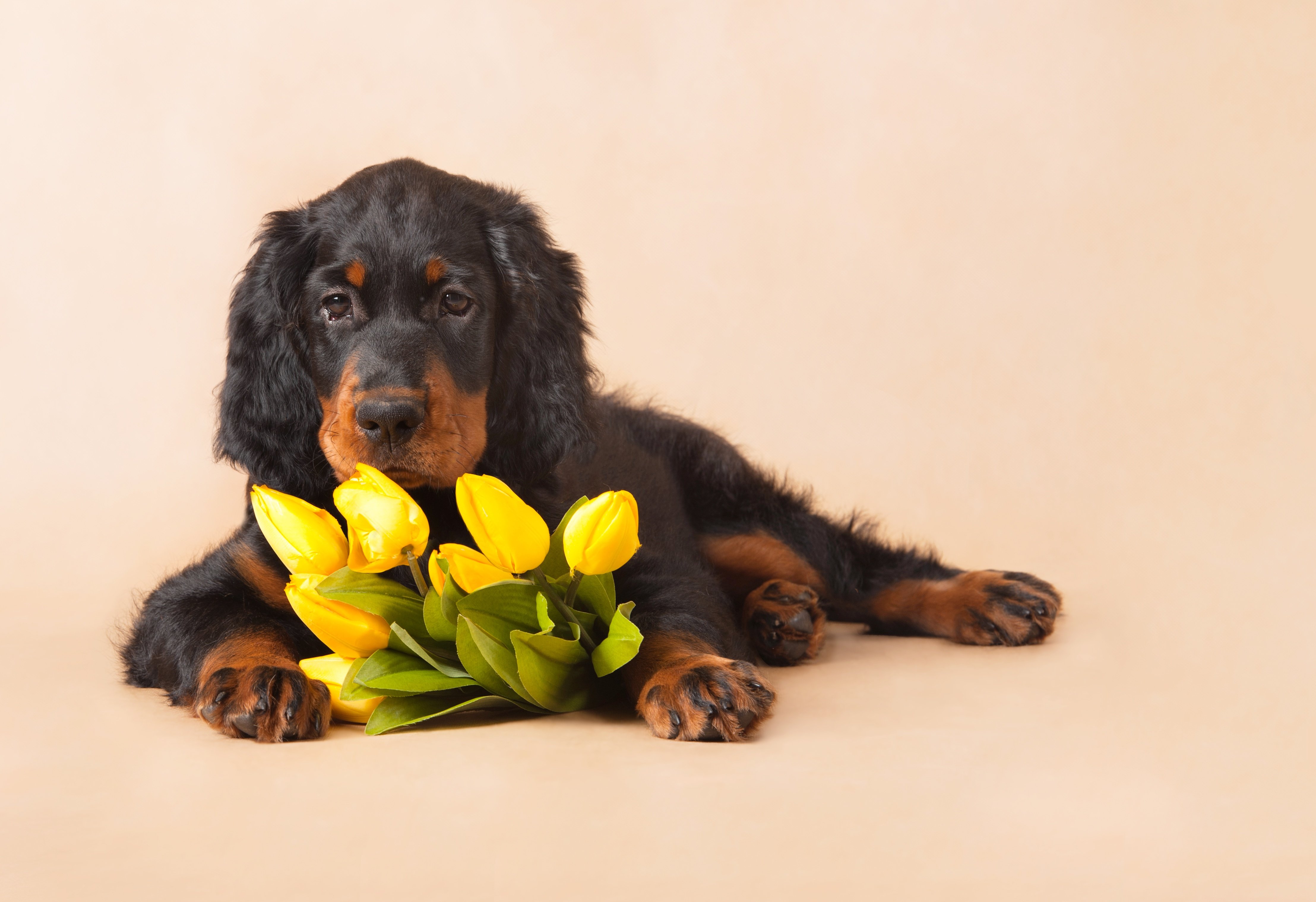 Щенок с тюльпанами