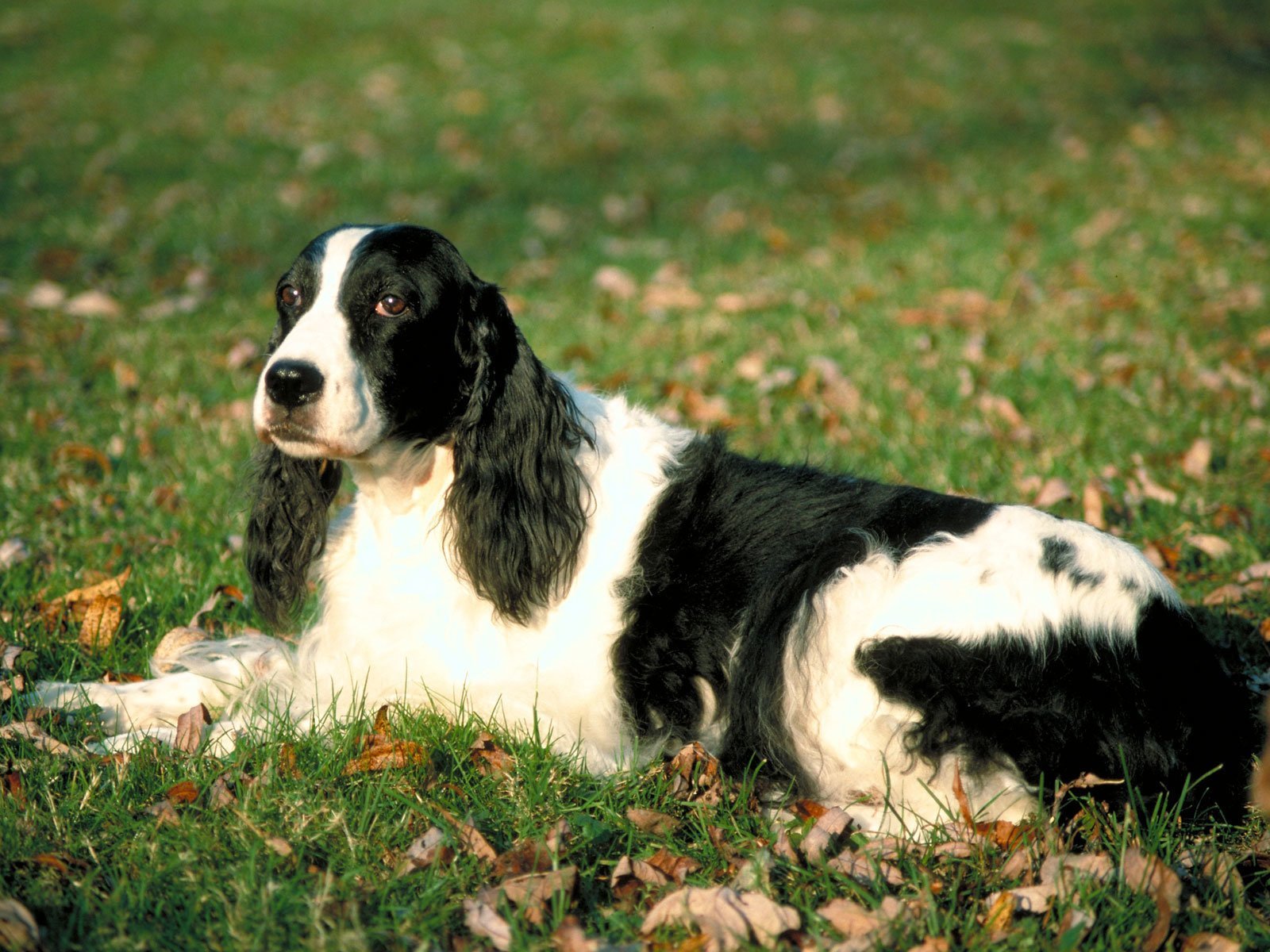 Русский охотничий спаниель лежит