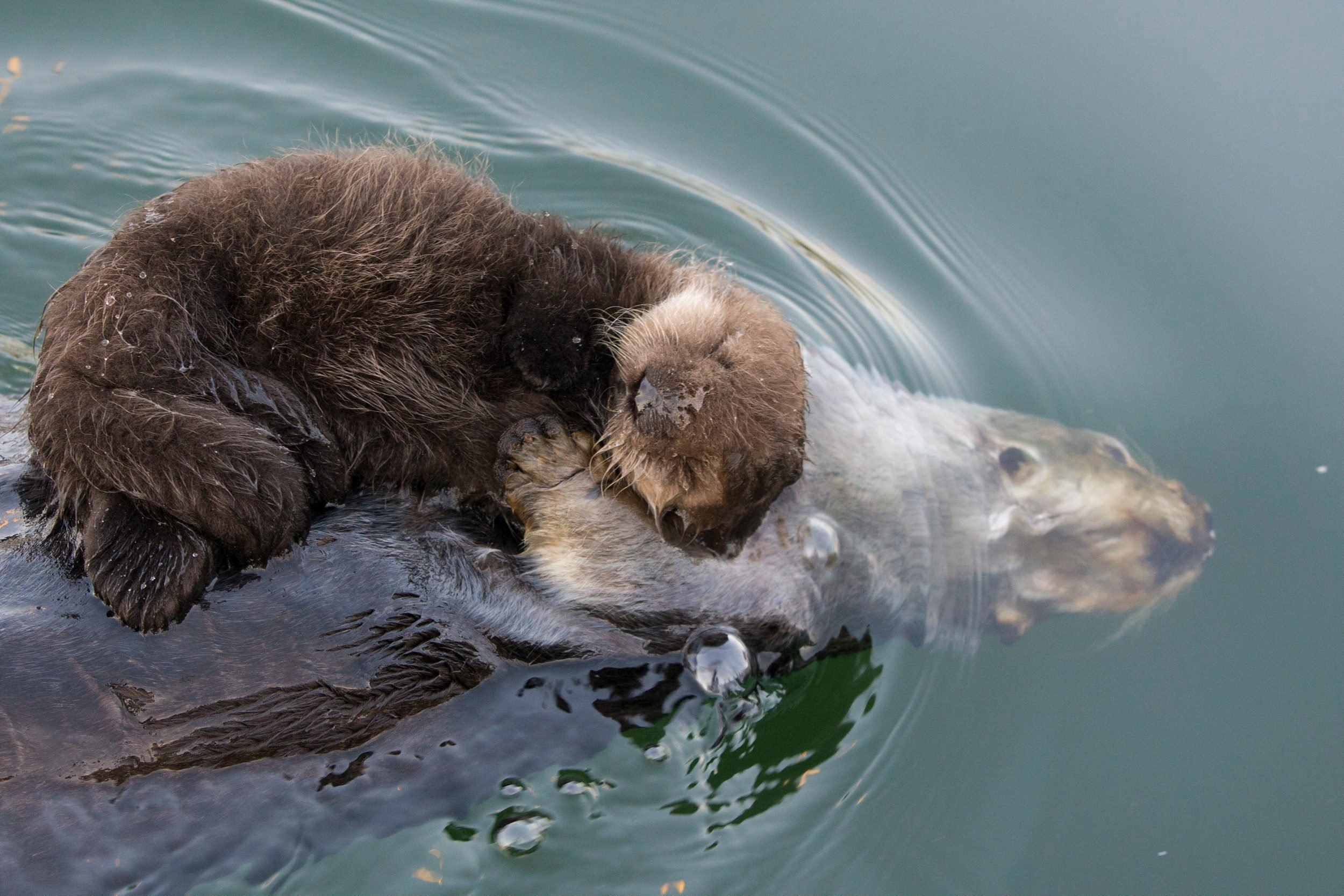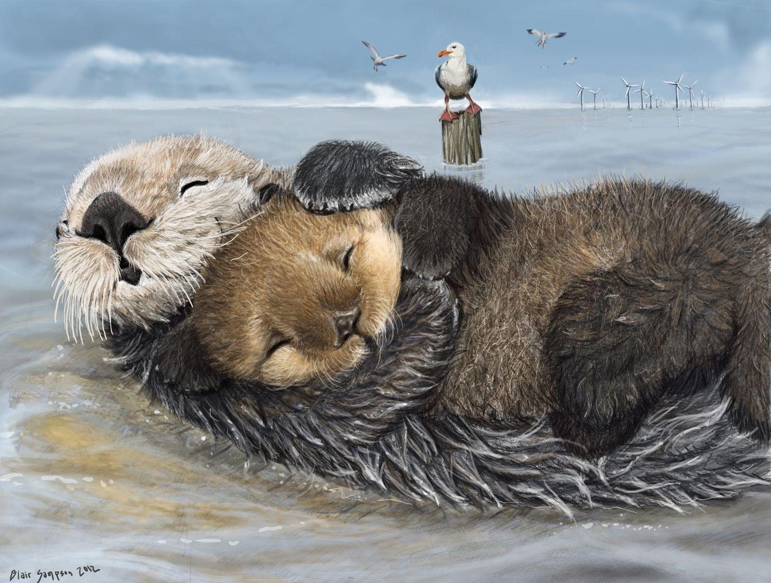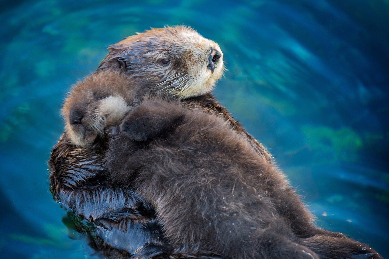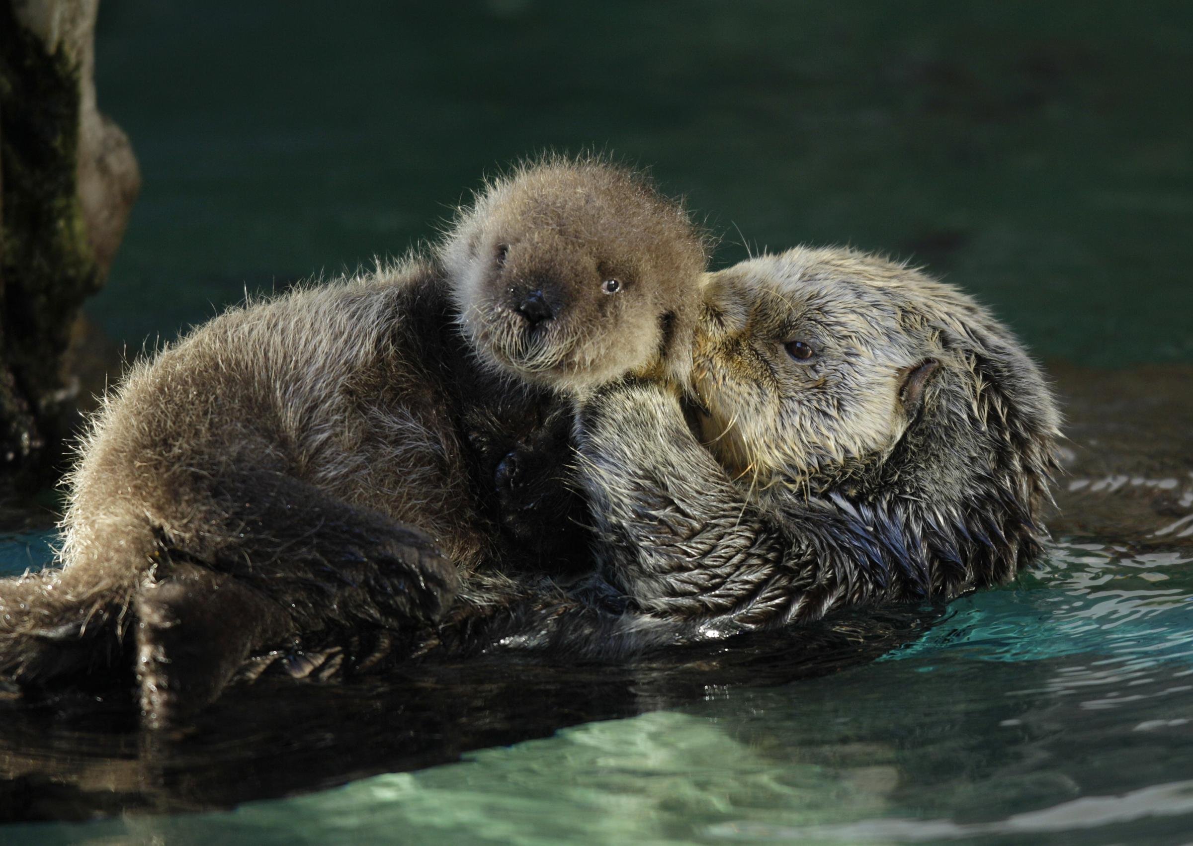 Выдра обнимает детеныша