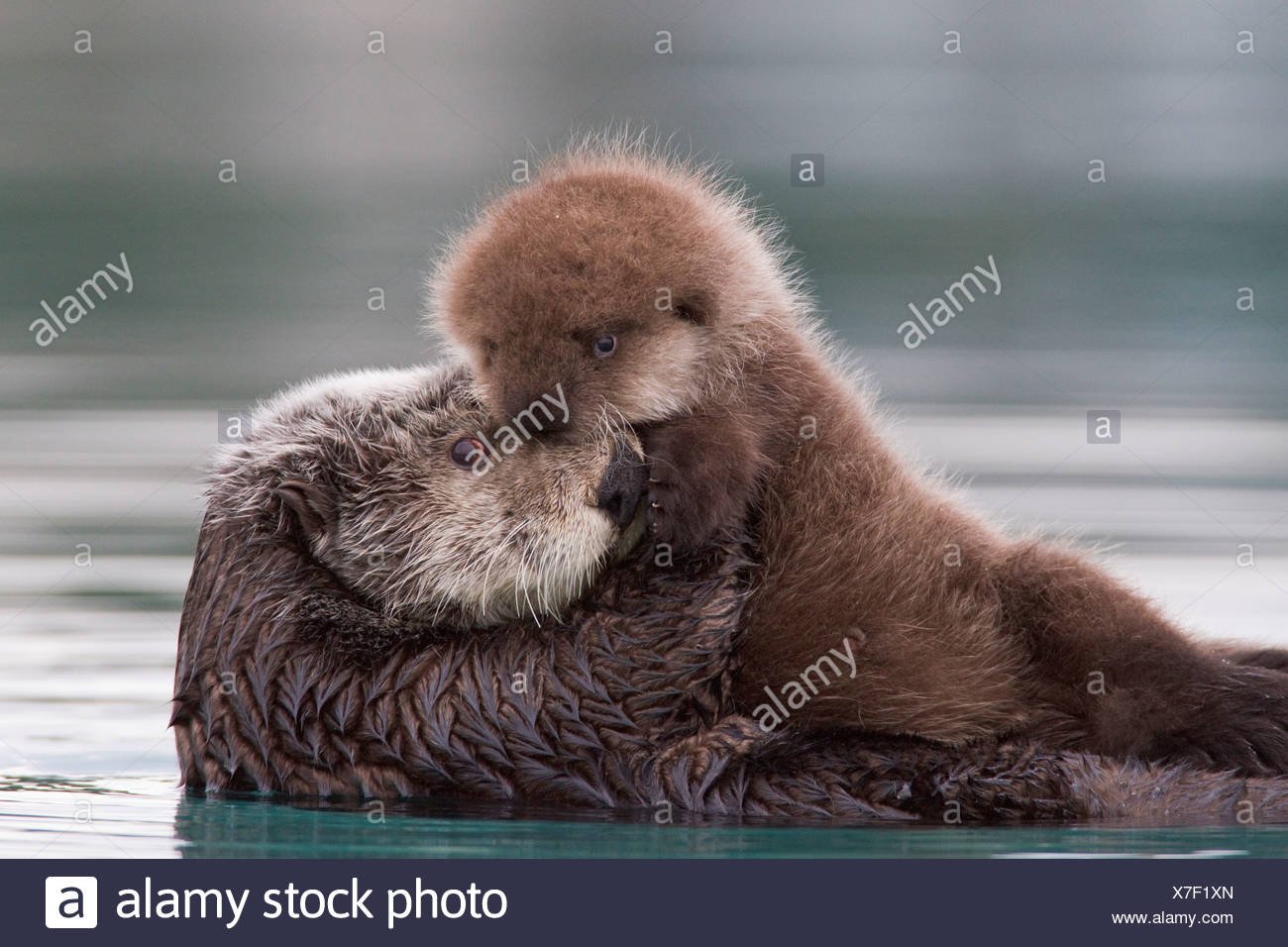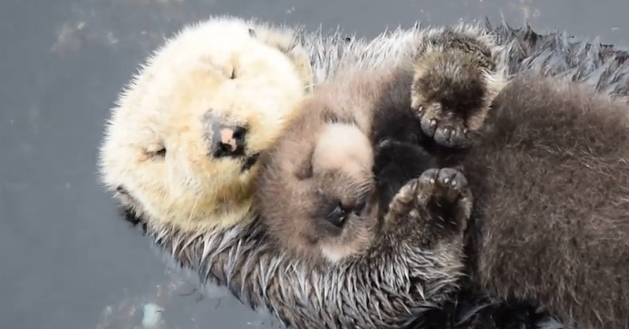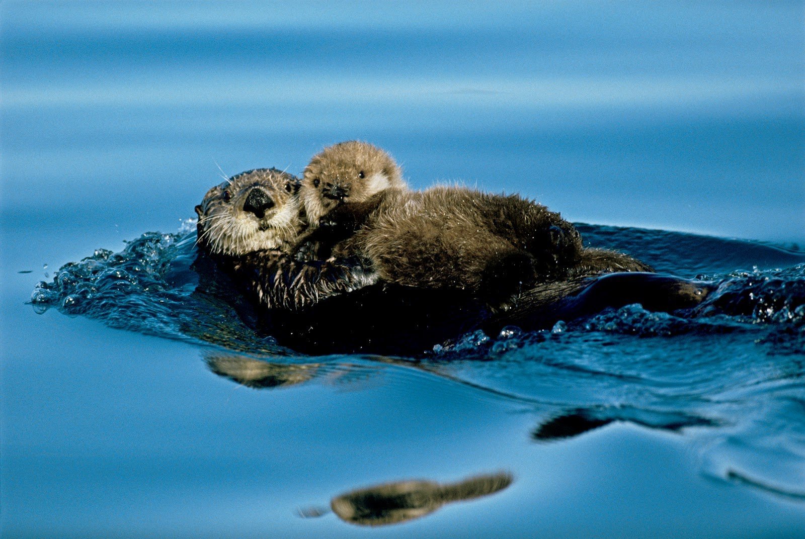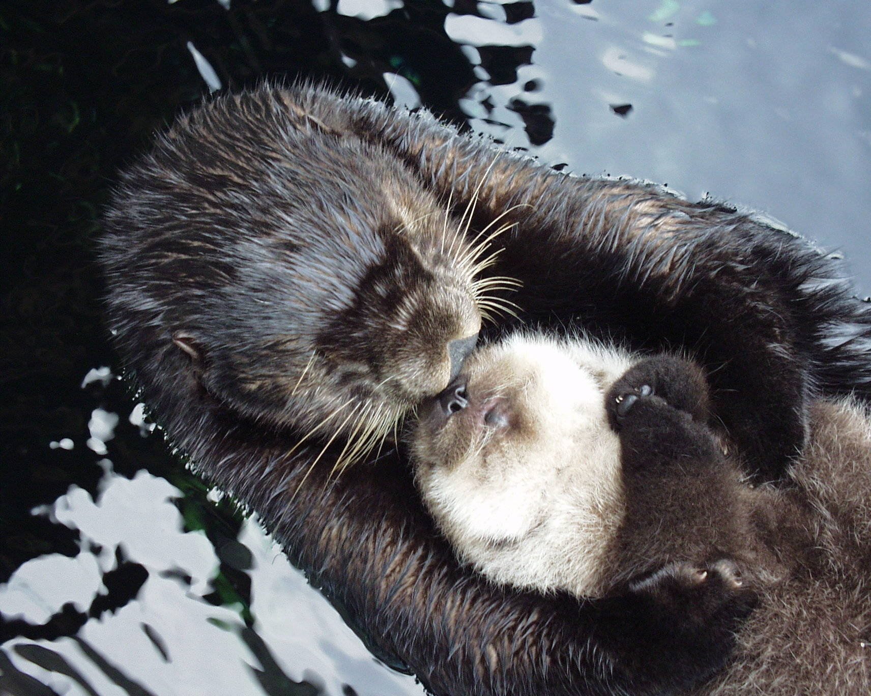 Выдра обнимает детеныша