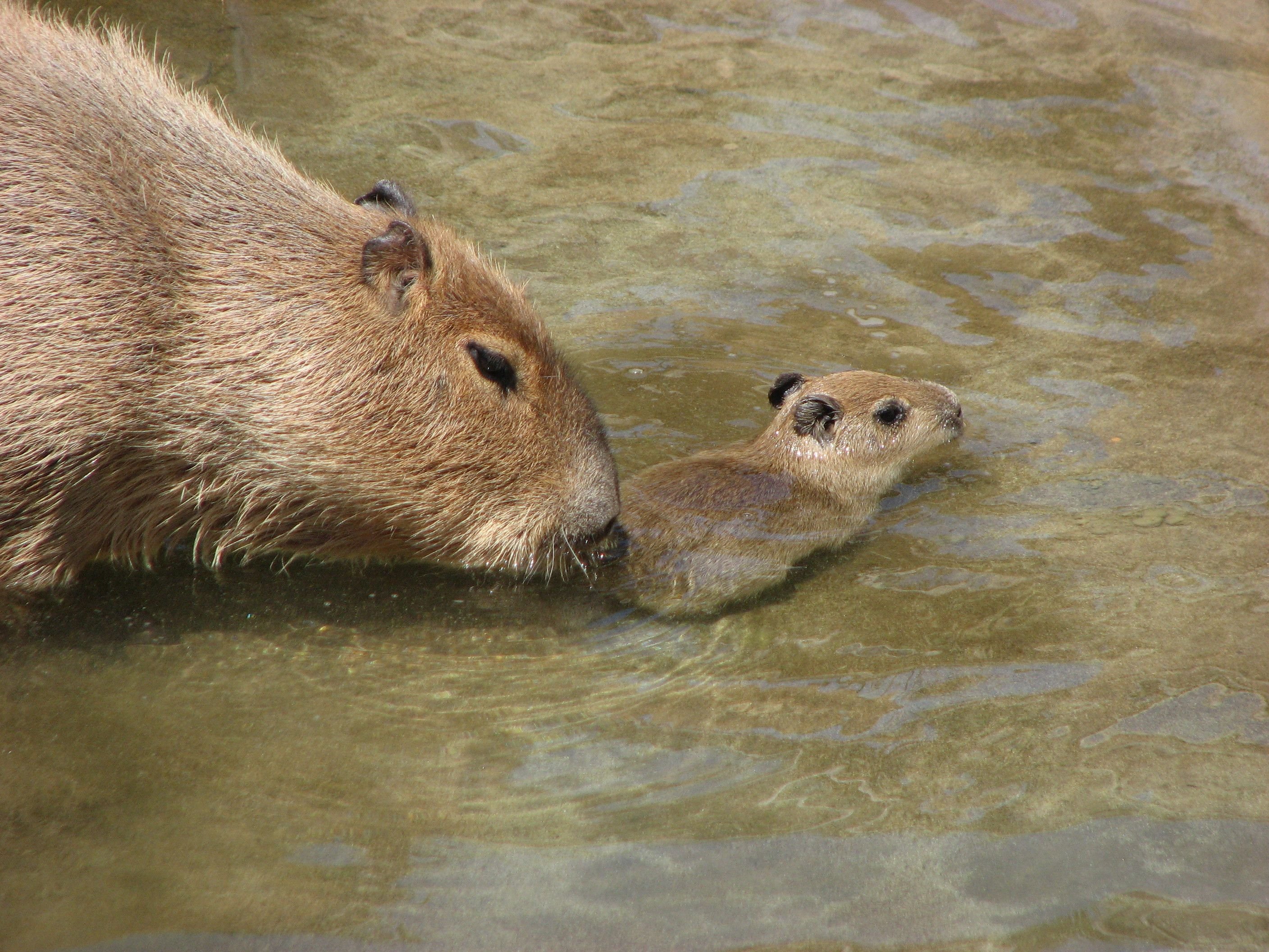 Капибара плывет с детенышами