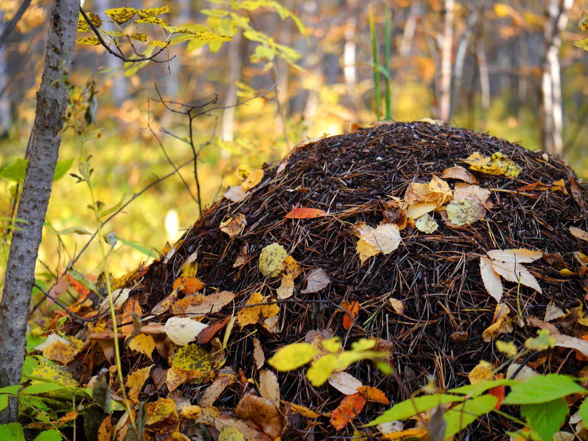 Муравейник осенью в лесу