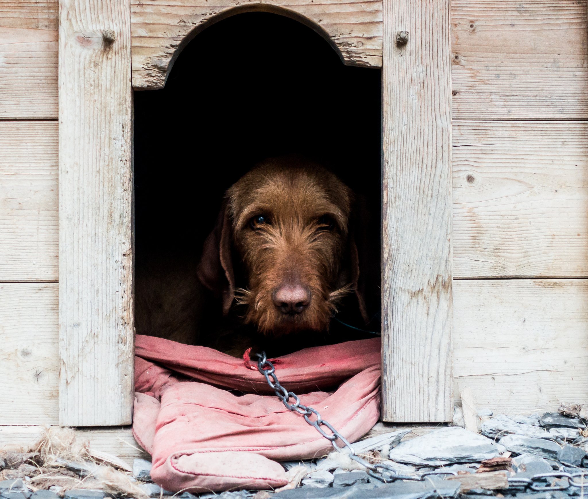 Собака грызёт подстилка в будке
