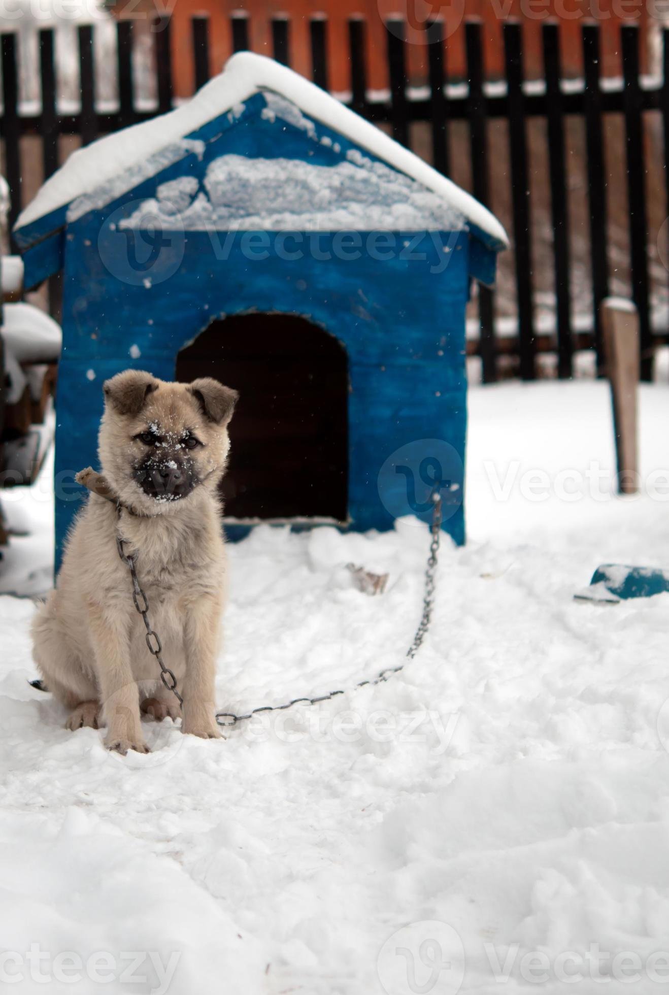 Собака в конуре со снегом