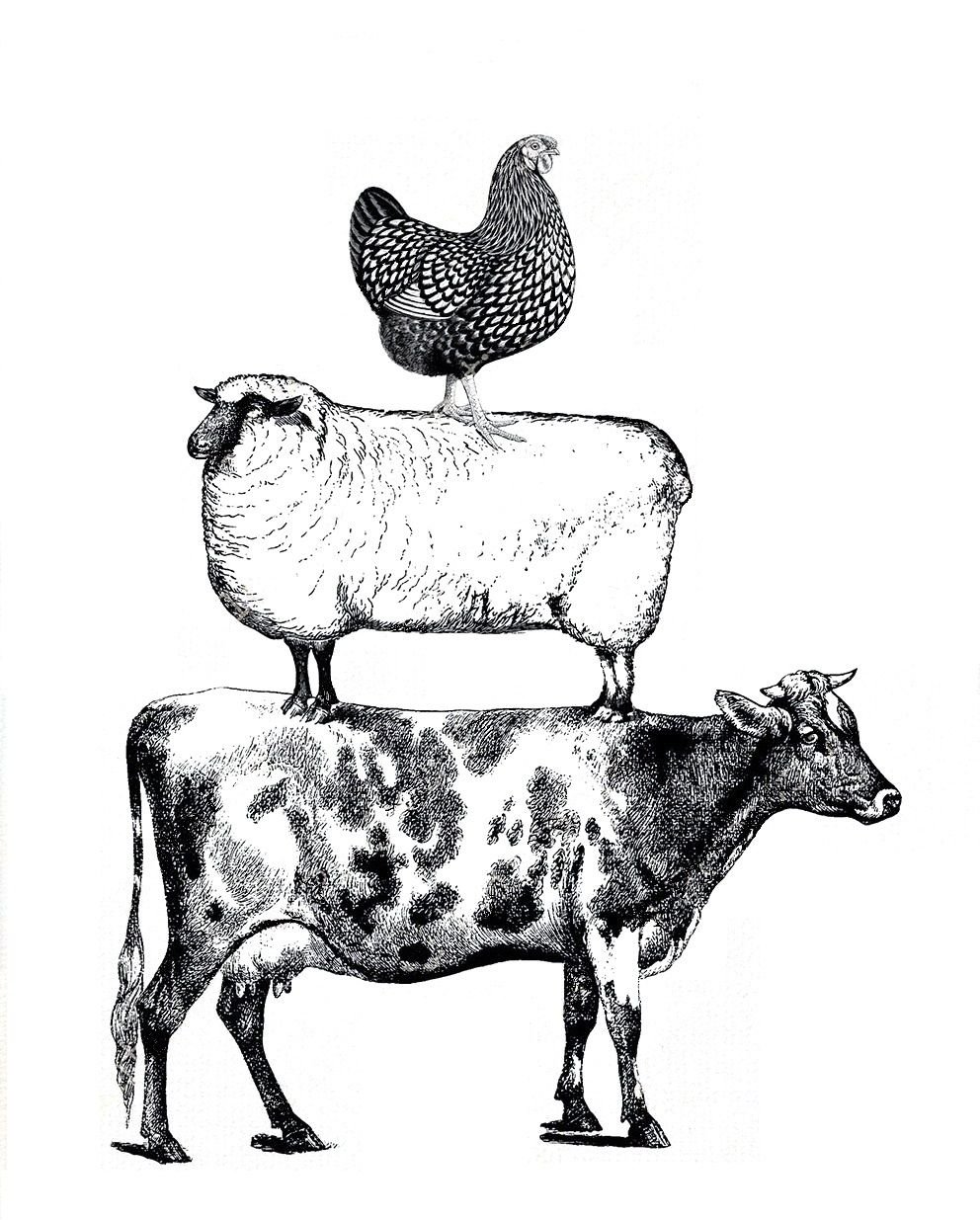 Корова и лошадь и свинья и курица