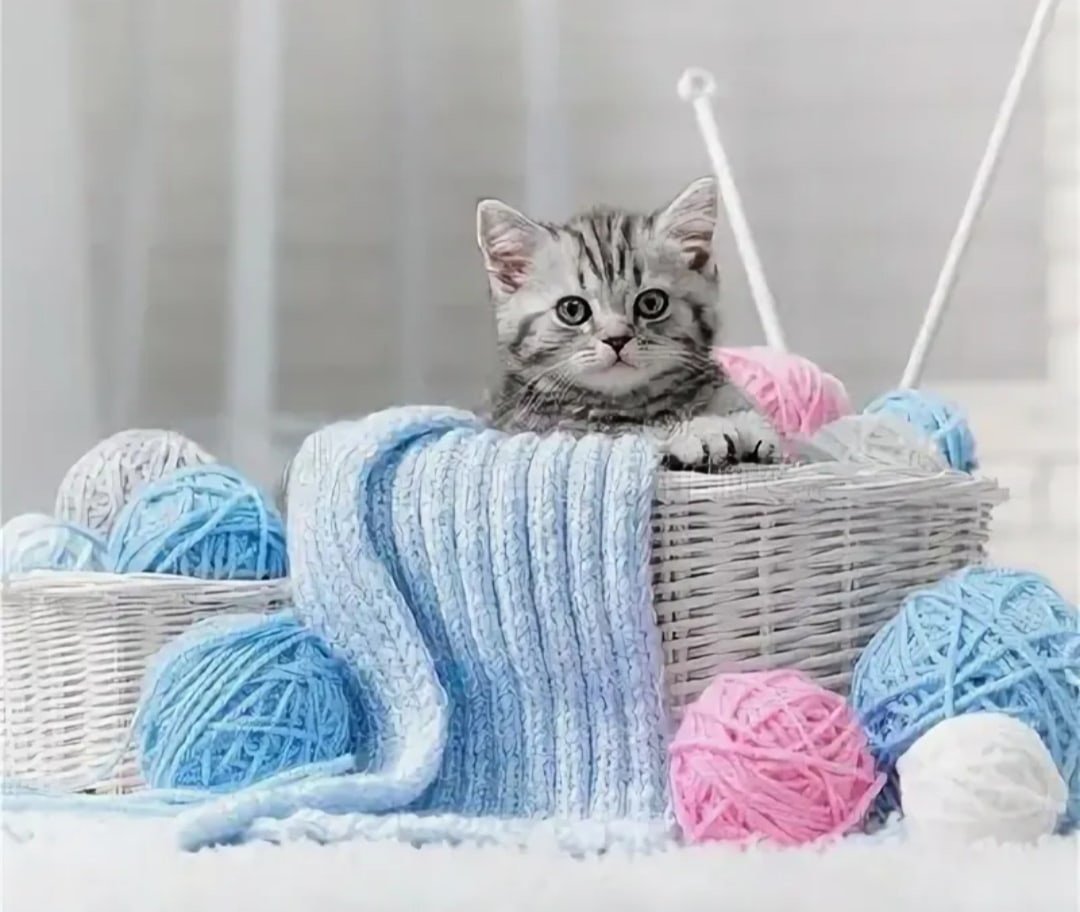 Котенок в корзинке с клубками