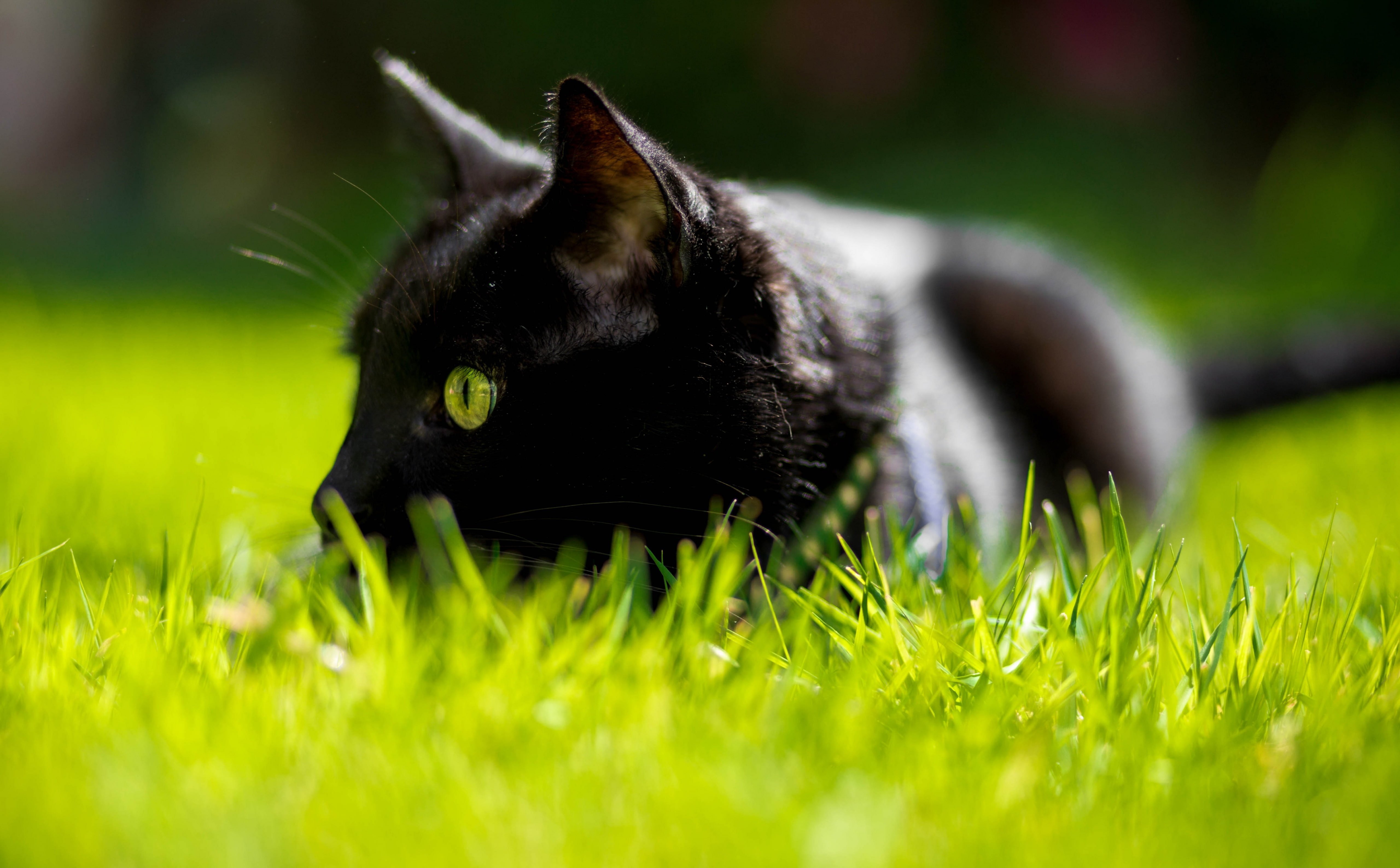 Черная кошка в траве
