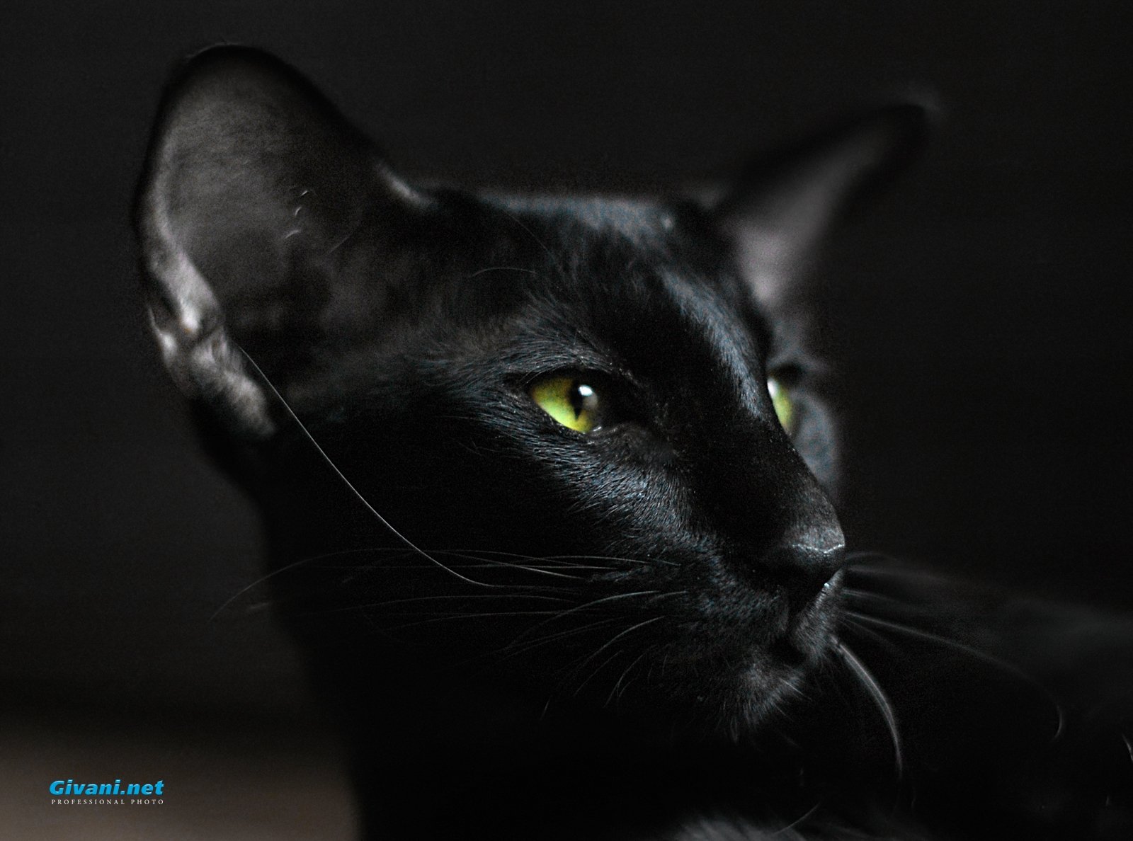 Чёрный ориентальный кот с голубыми глазами