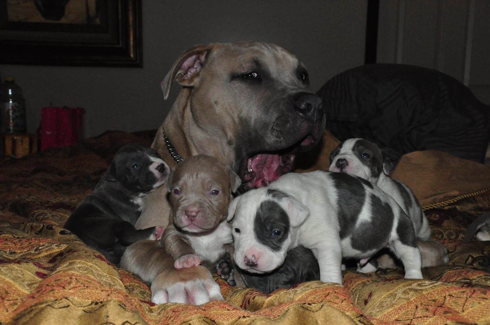 Питбуль и щенки питбуля