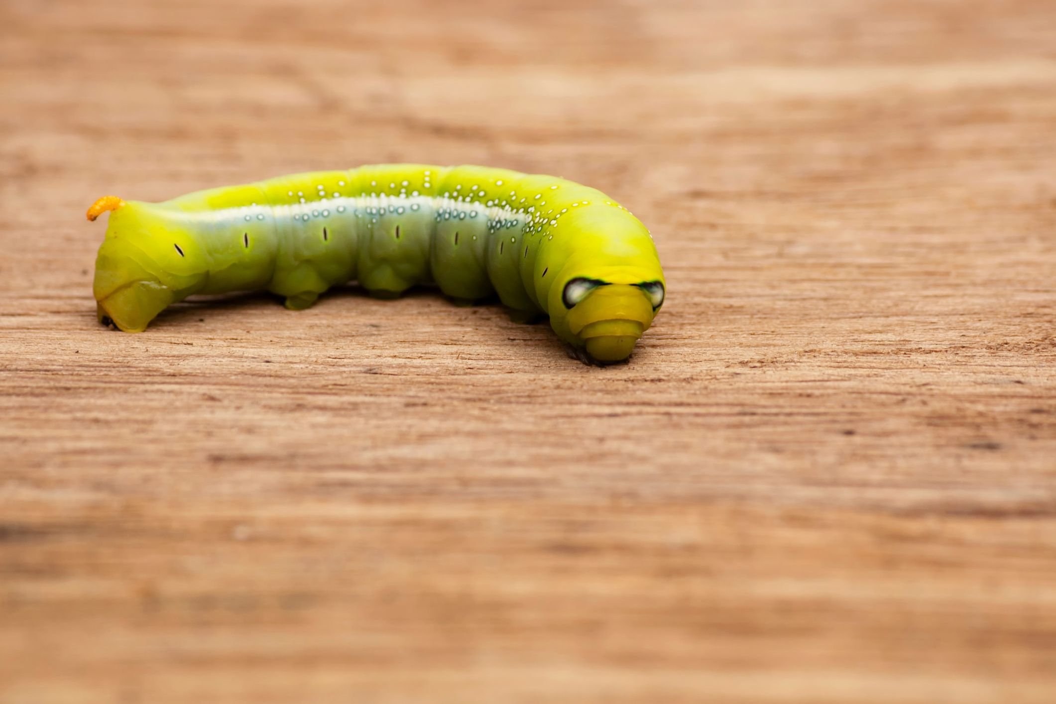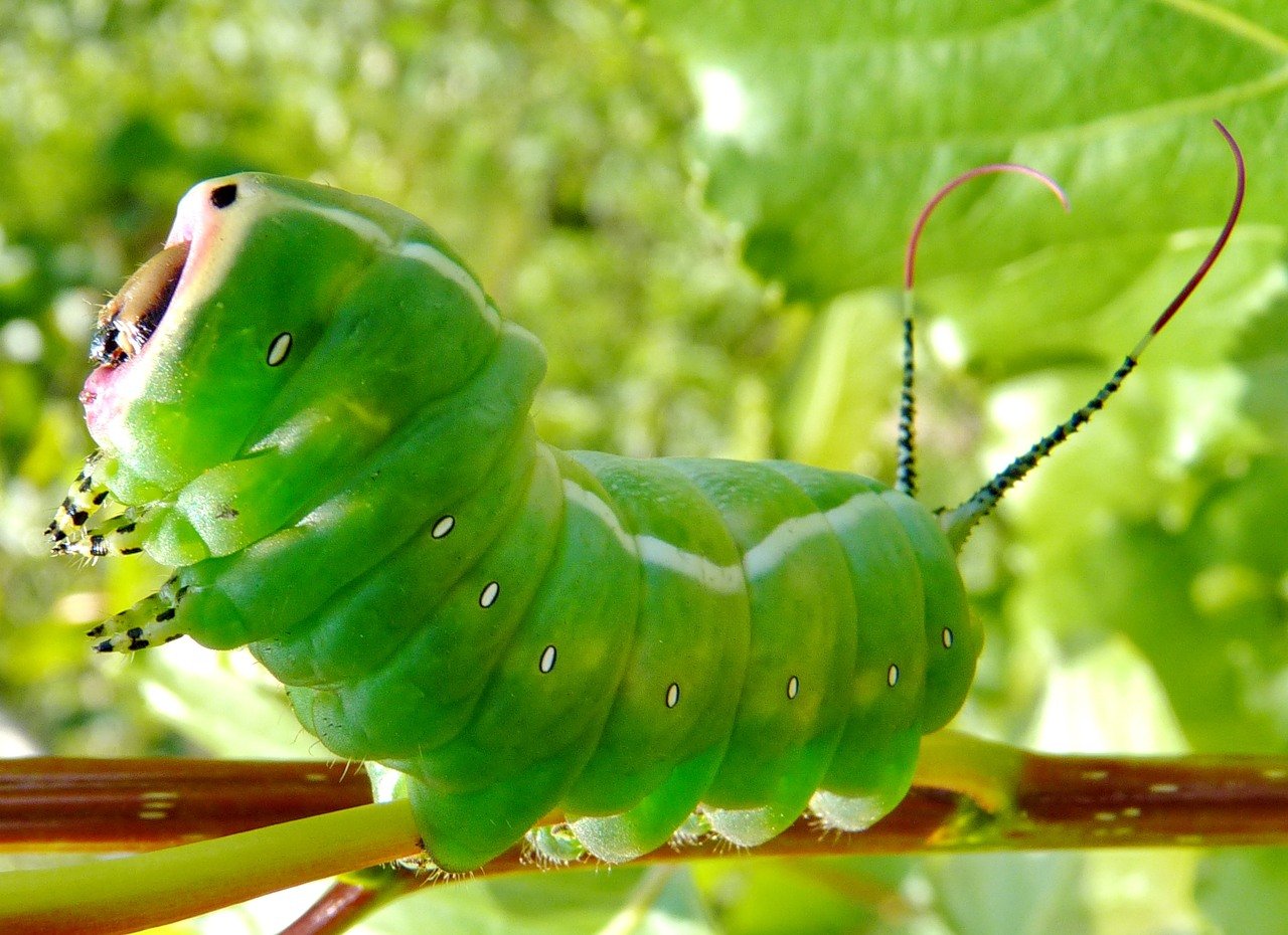 Толстая зеленая гусеница с шипом на хвосте
