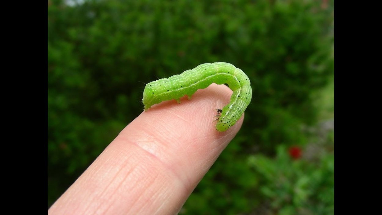 На листьях зеленый червяк