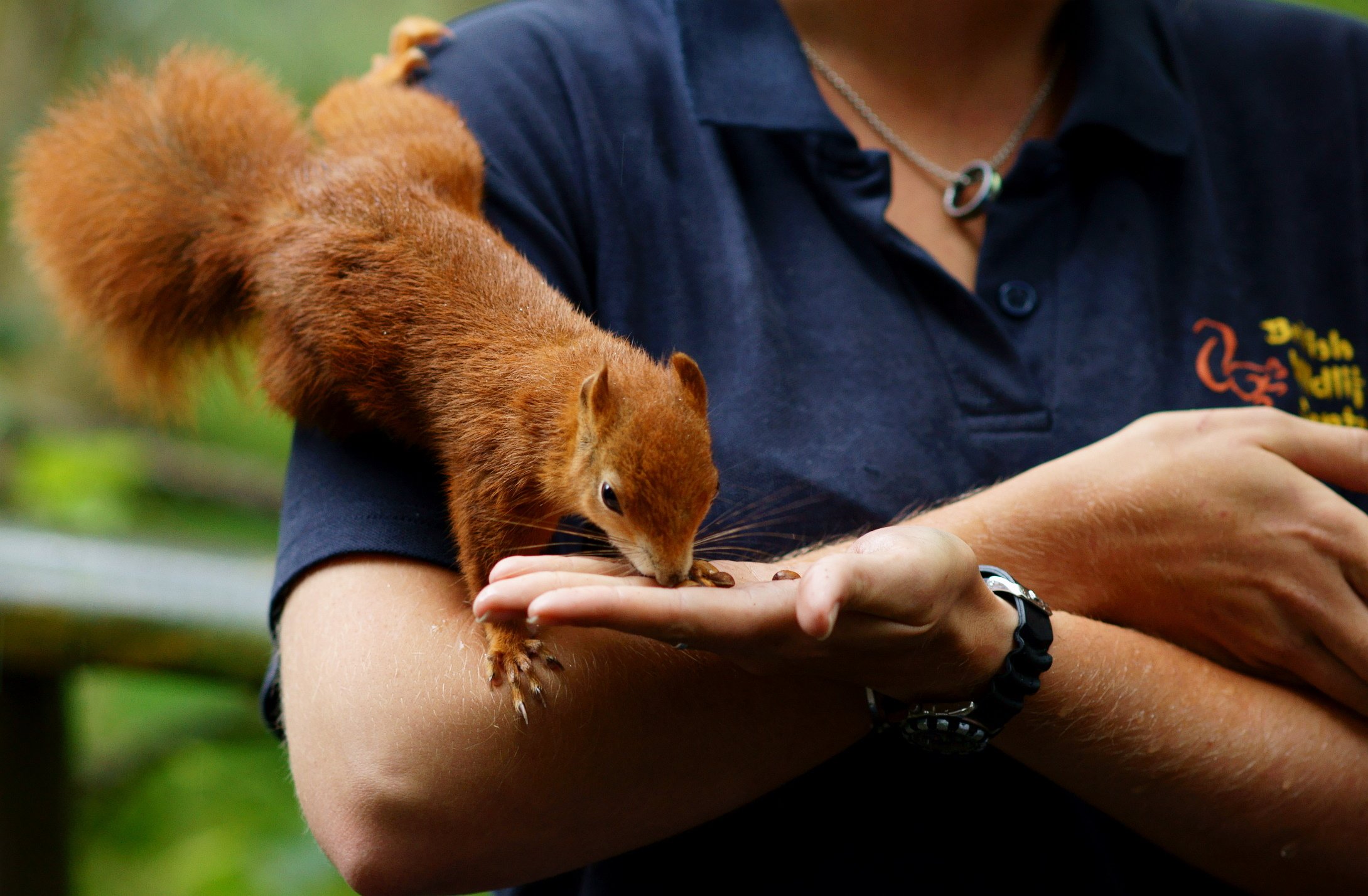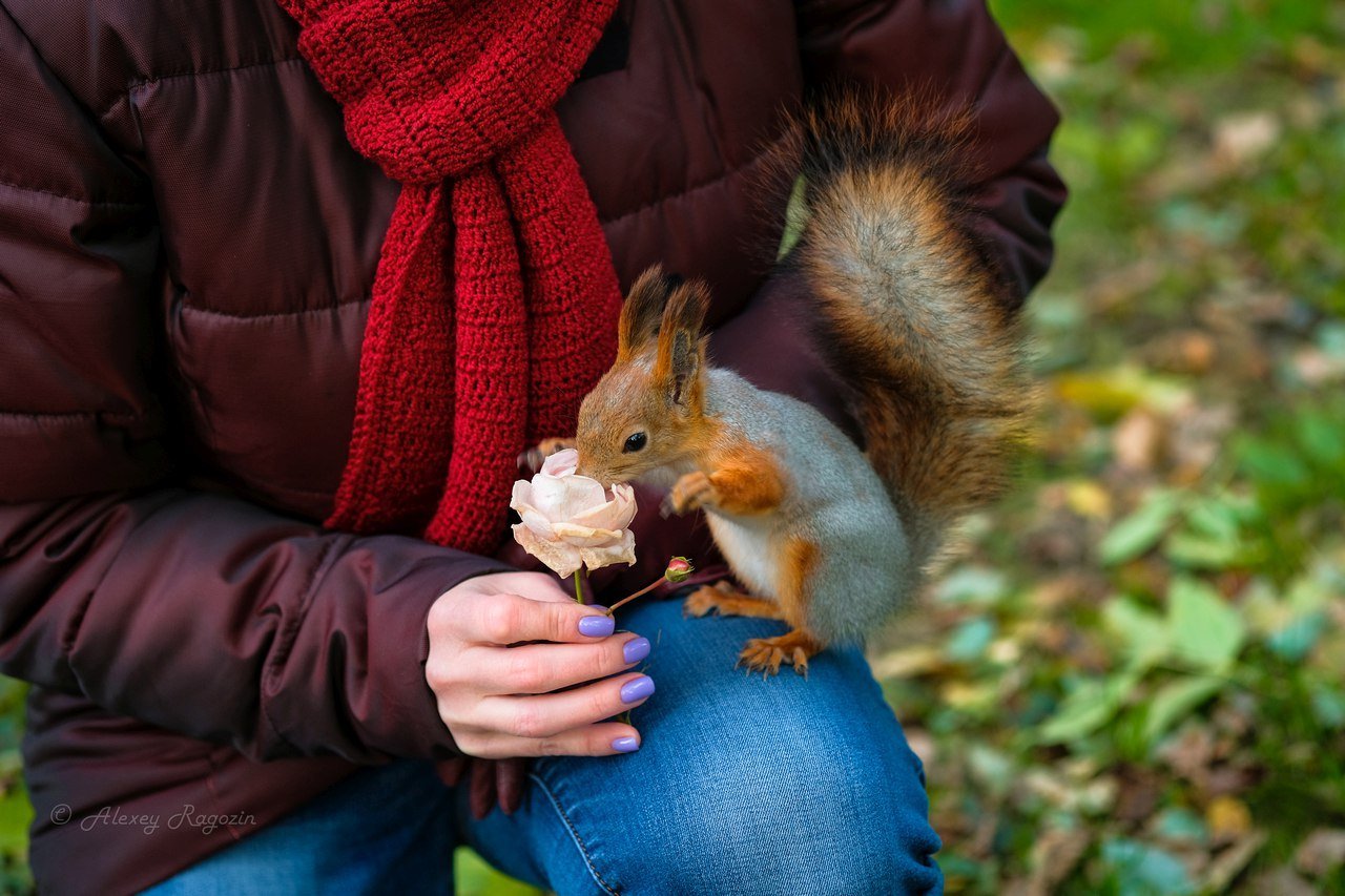 Человек кормит белку