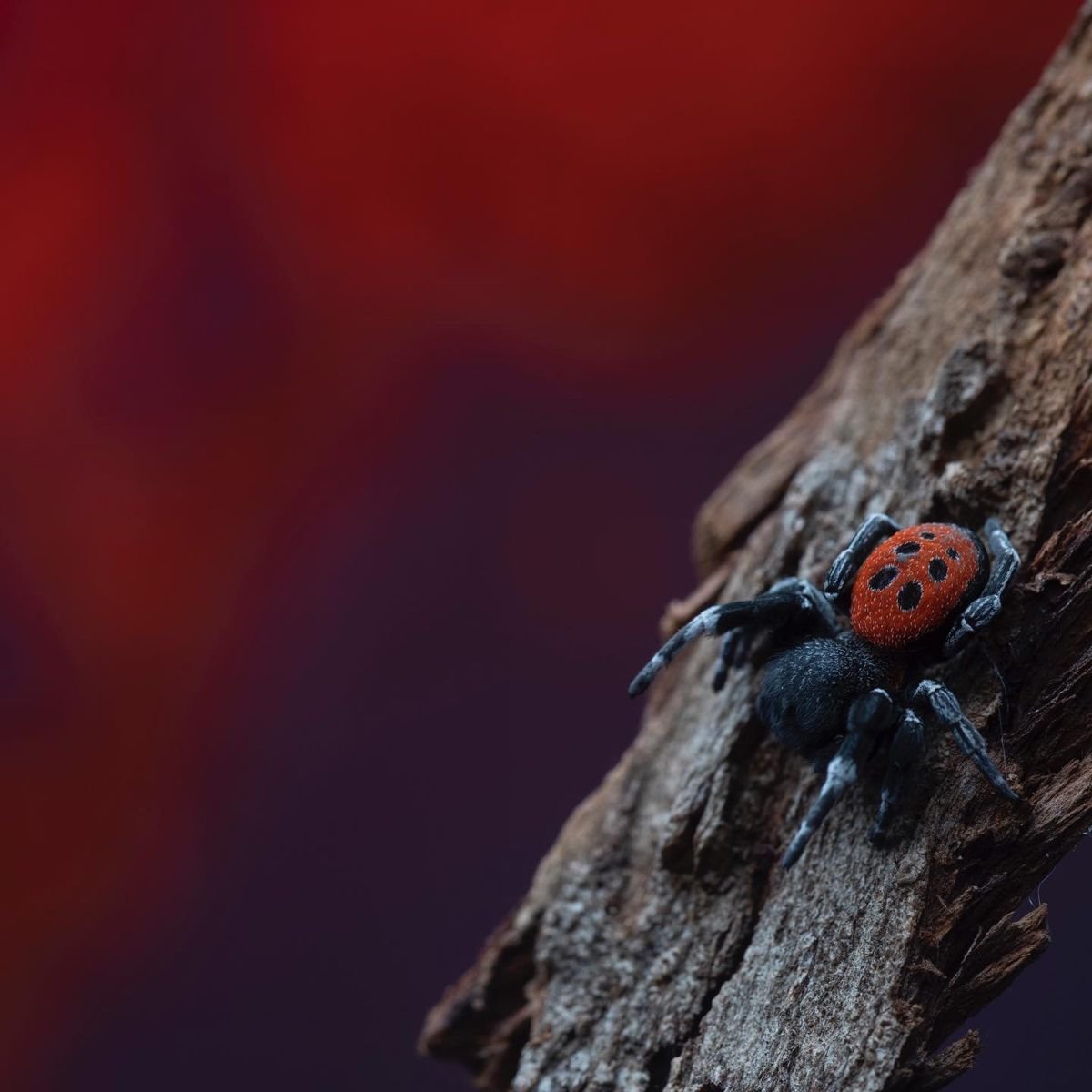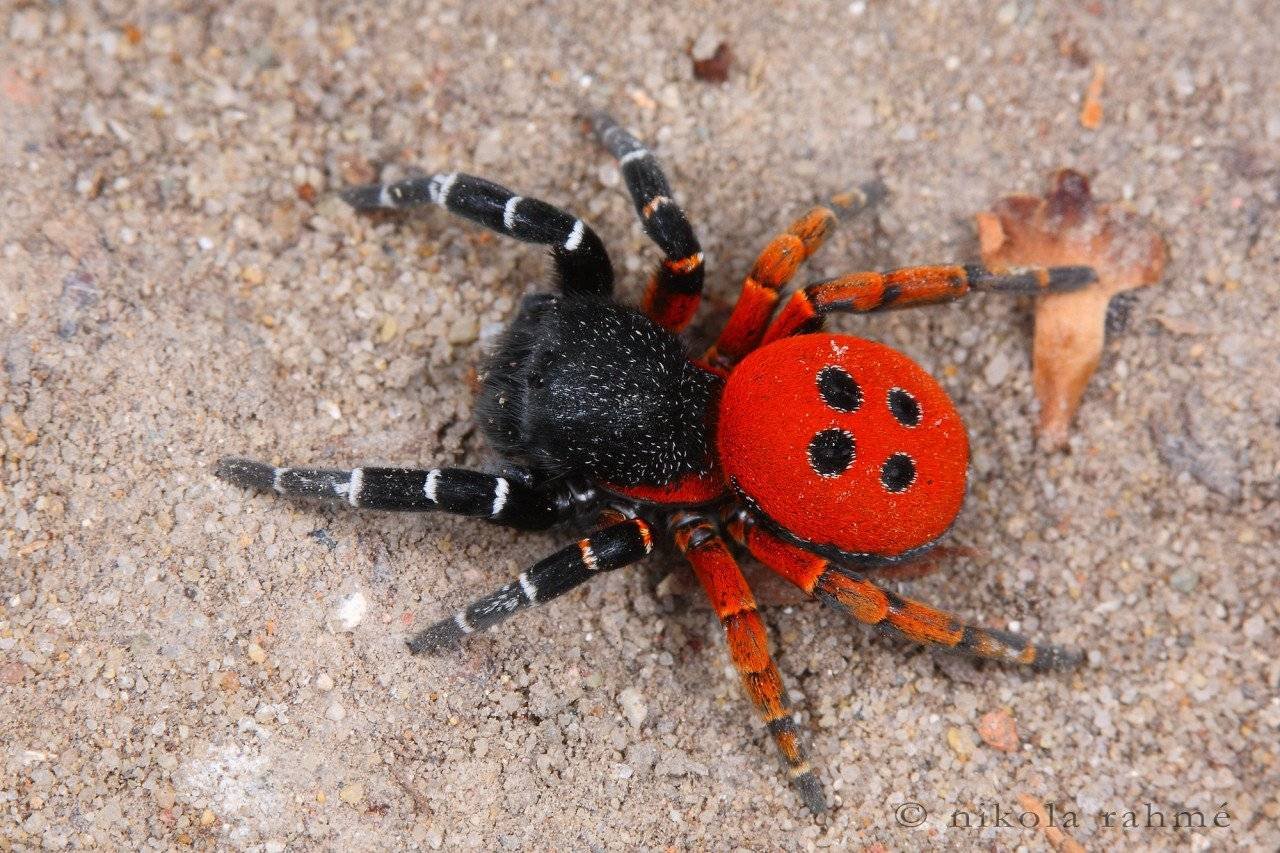 Паук с красным брюшком и четырьмя черными точками