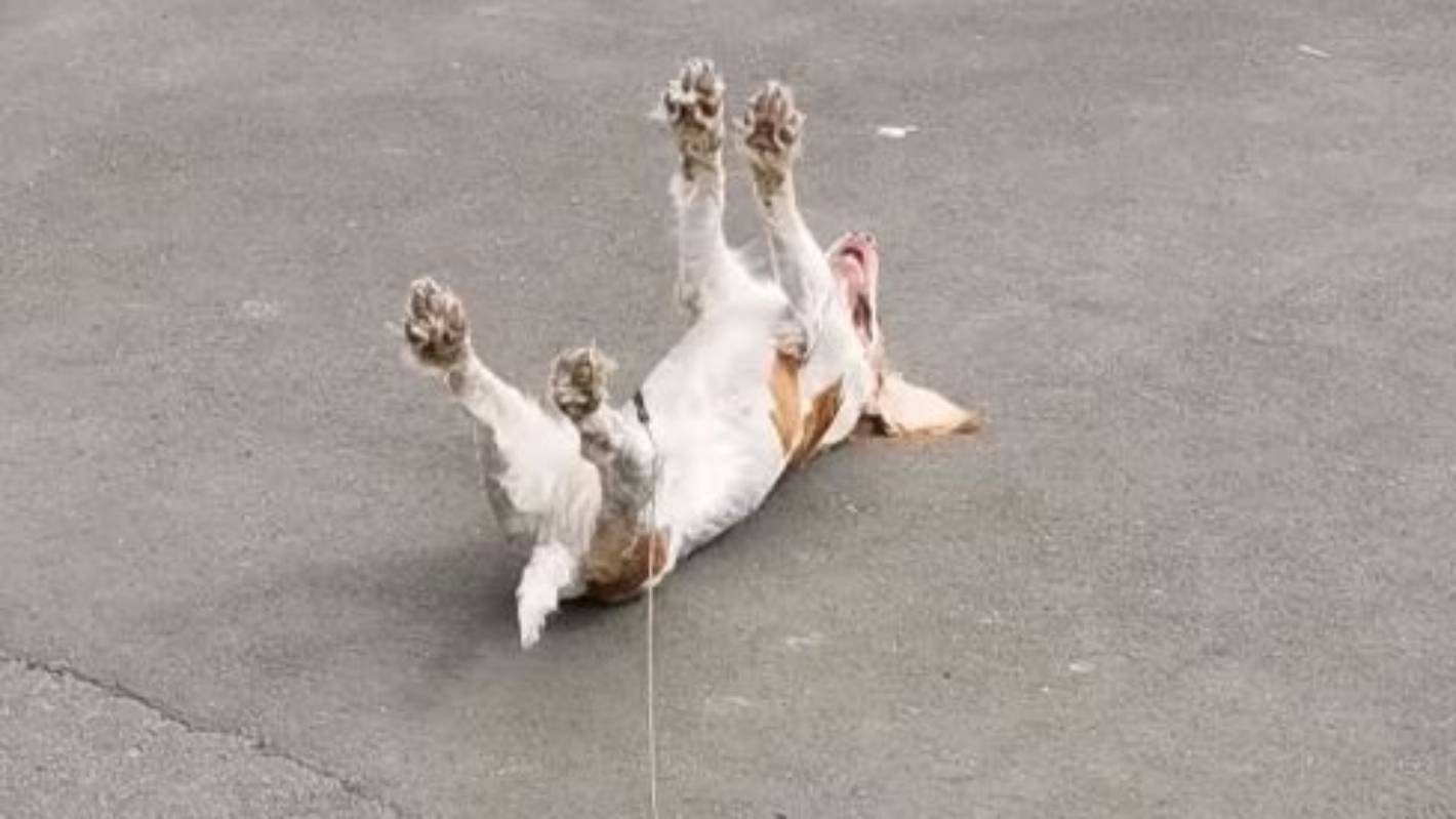 Собака лежит лапами кверху