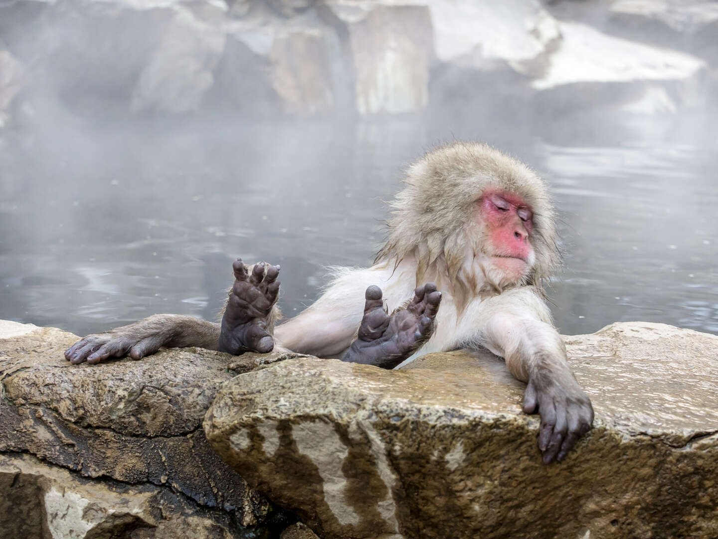 Обезьяна купается в горячем источнике