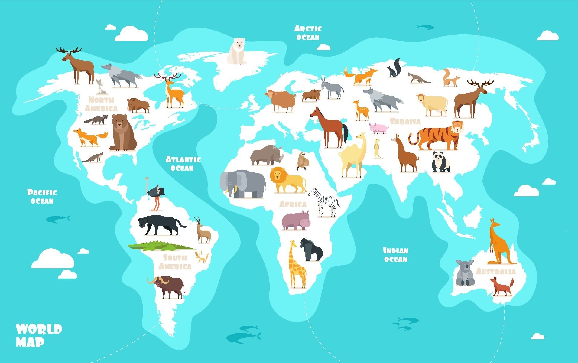 Карта континентов с силуэтами животных