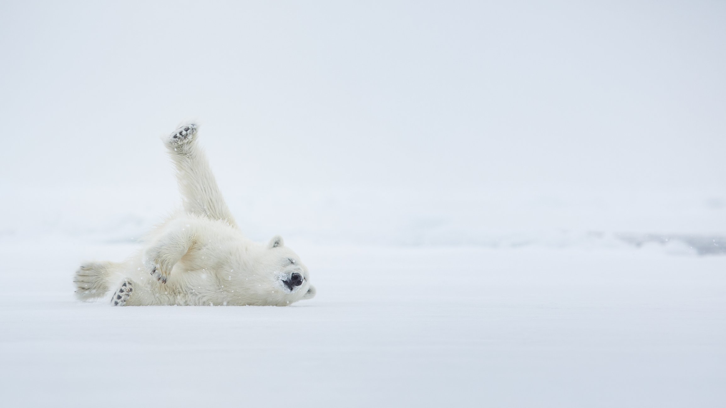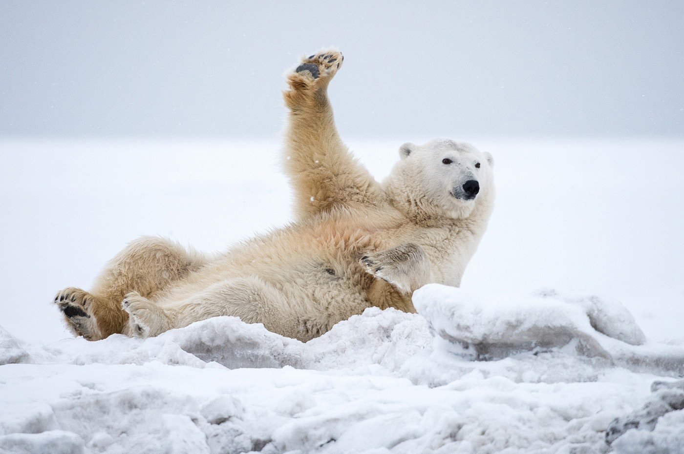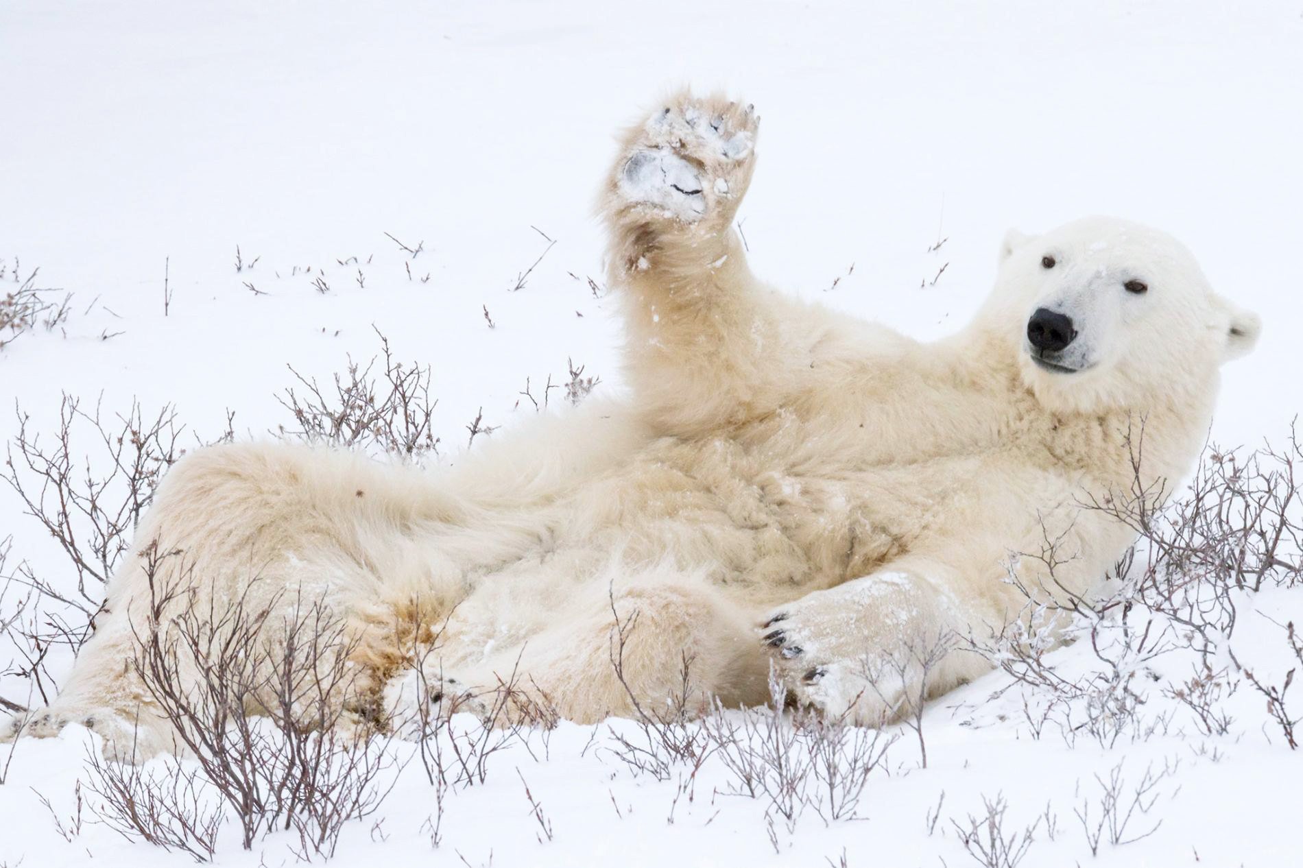 Белый медведь валяется на снегу