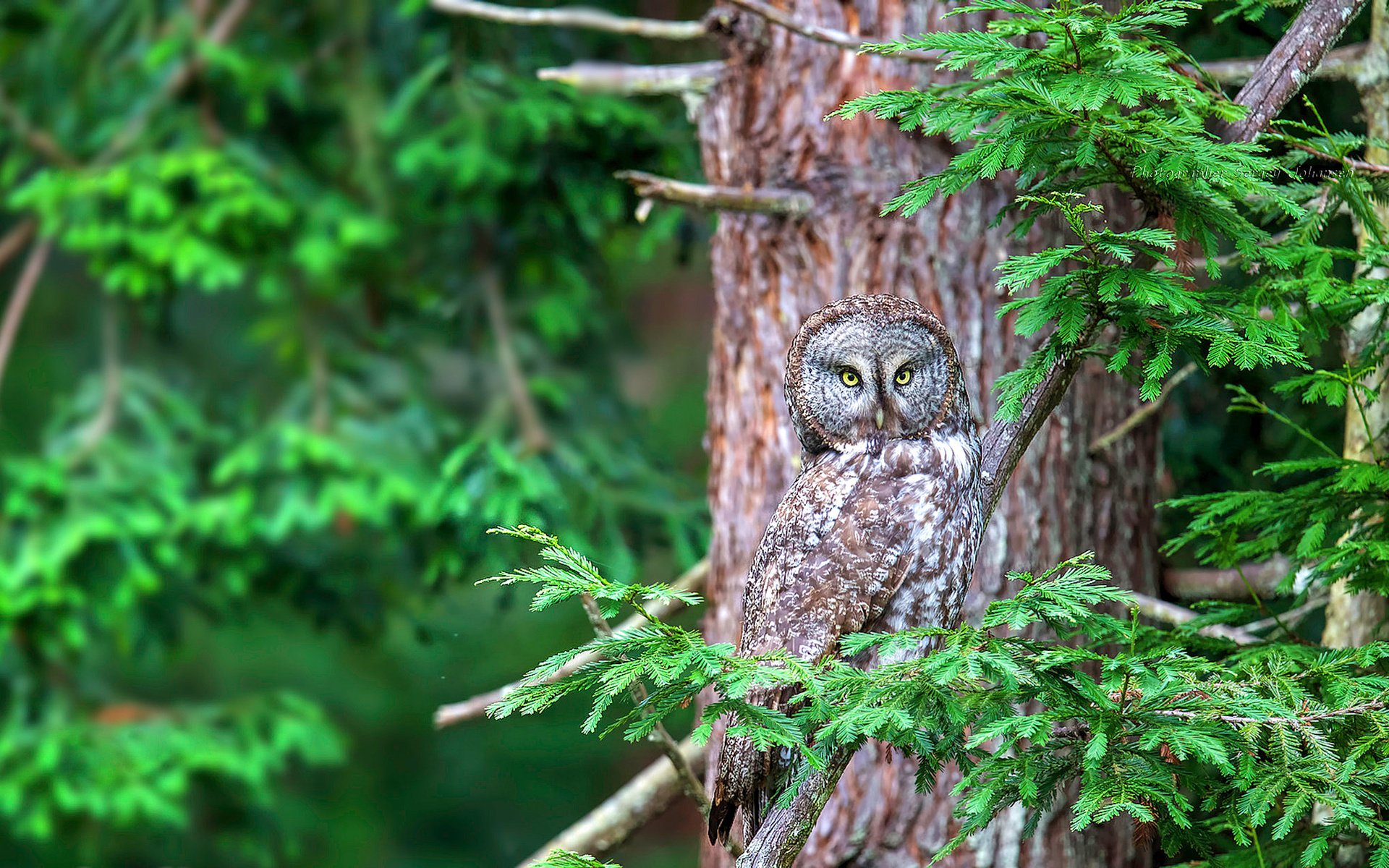 Сова на ветке ели