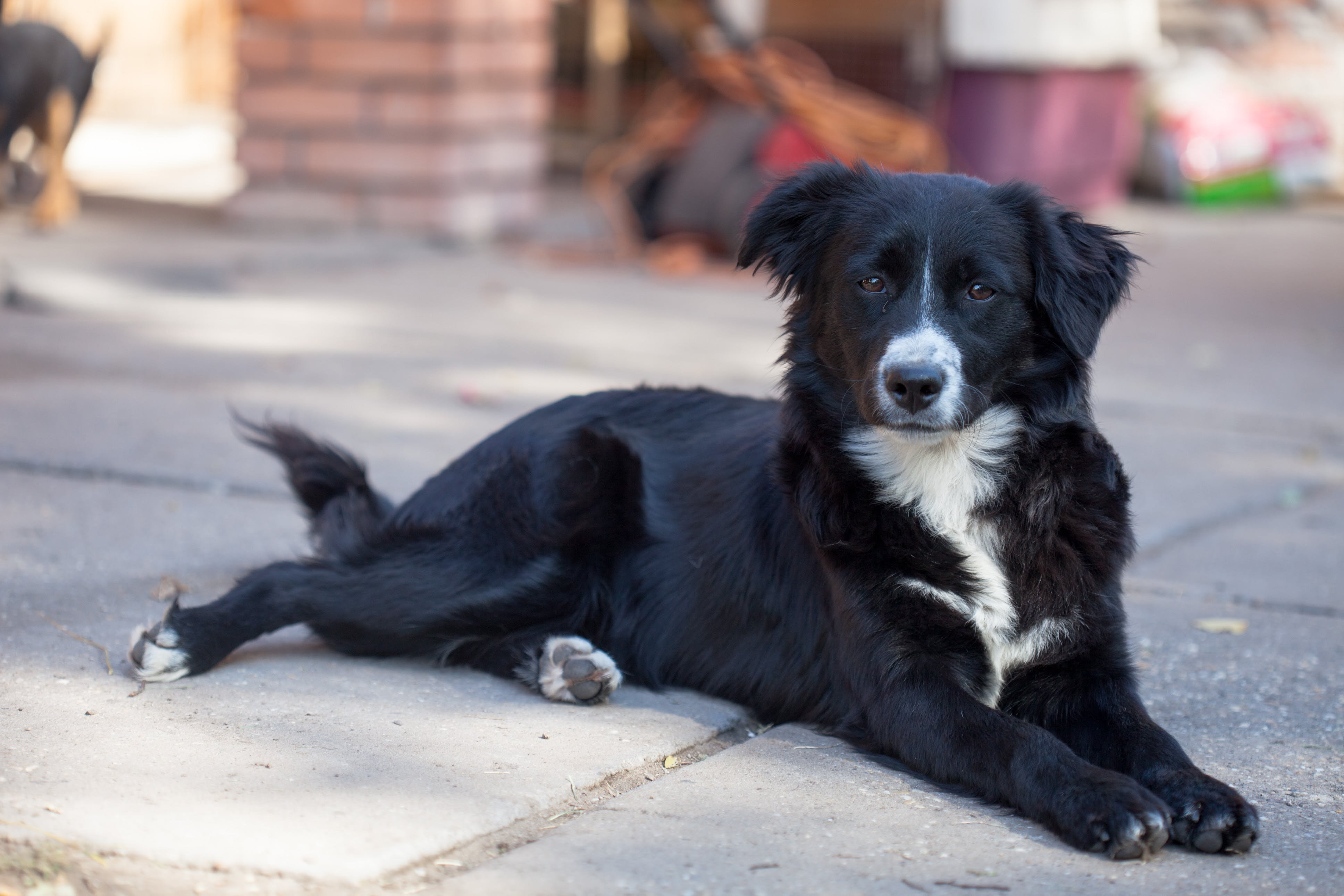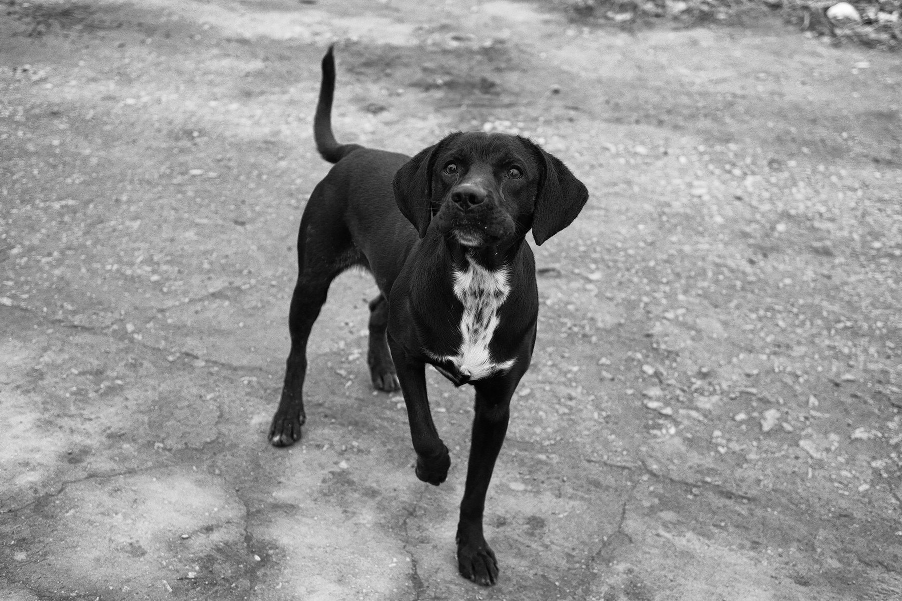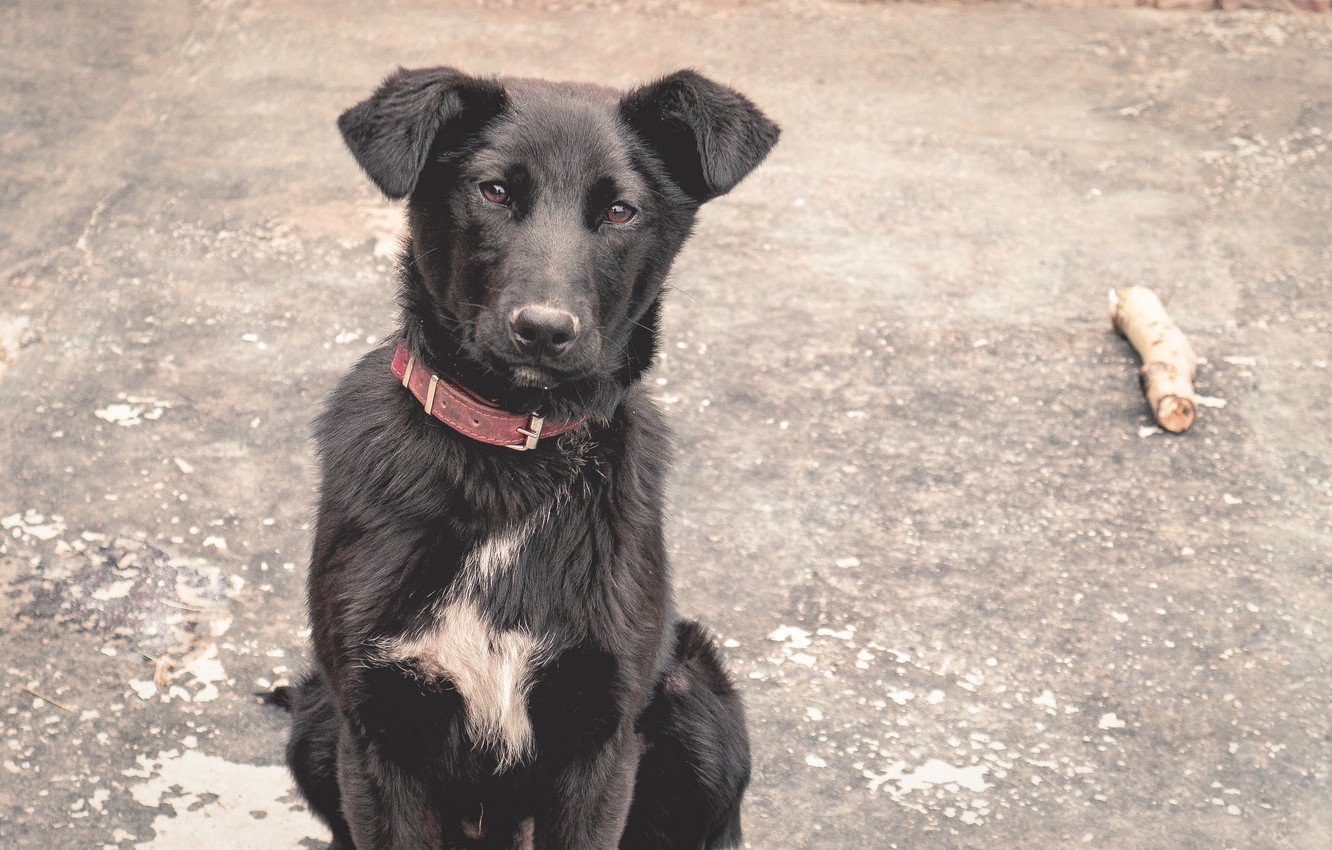 Черная дворняга с белой грудкой
