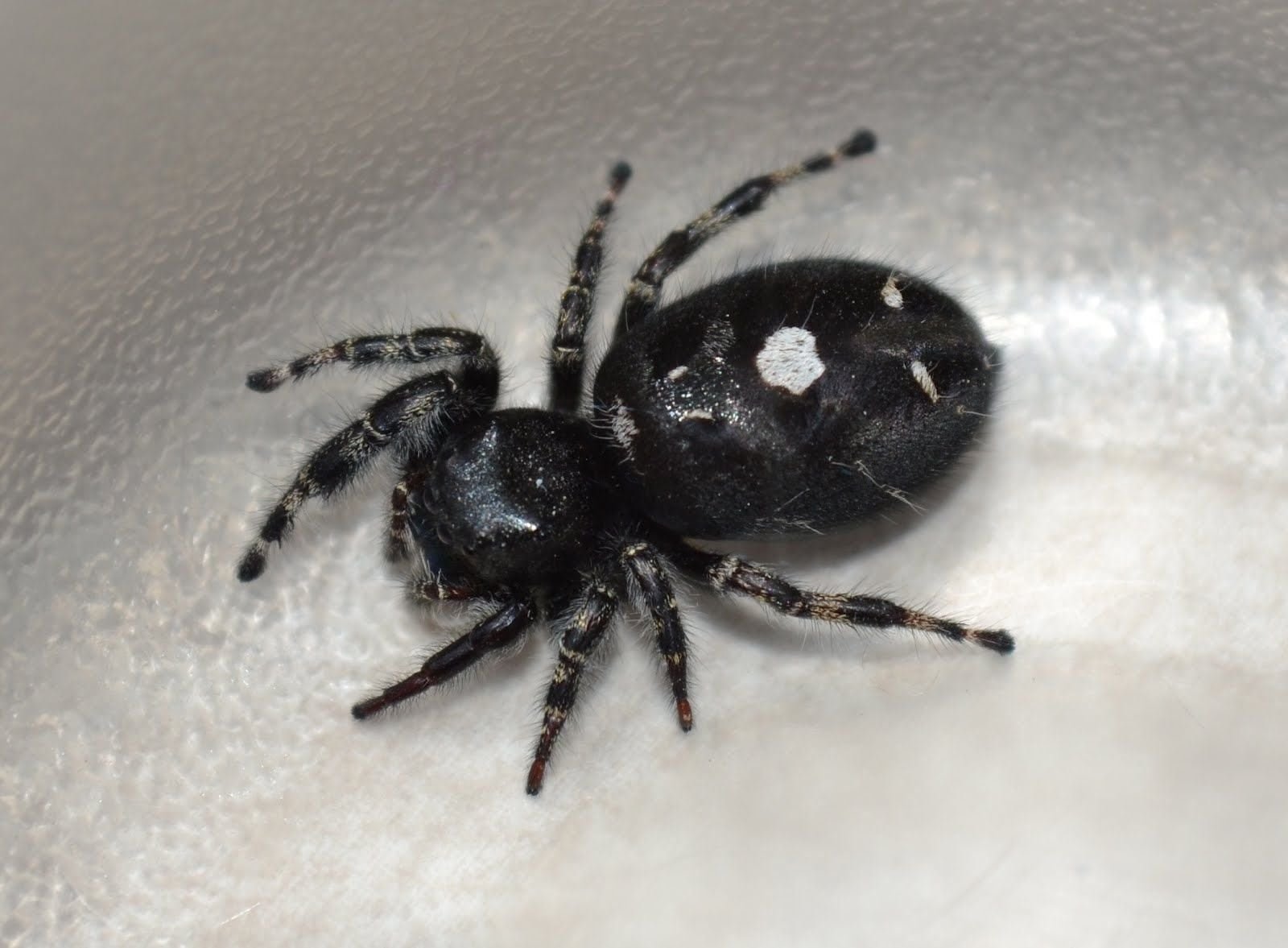 Чёрный паук с белыми пятнами на лапах