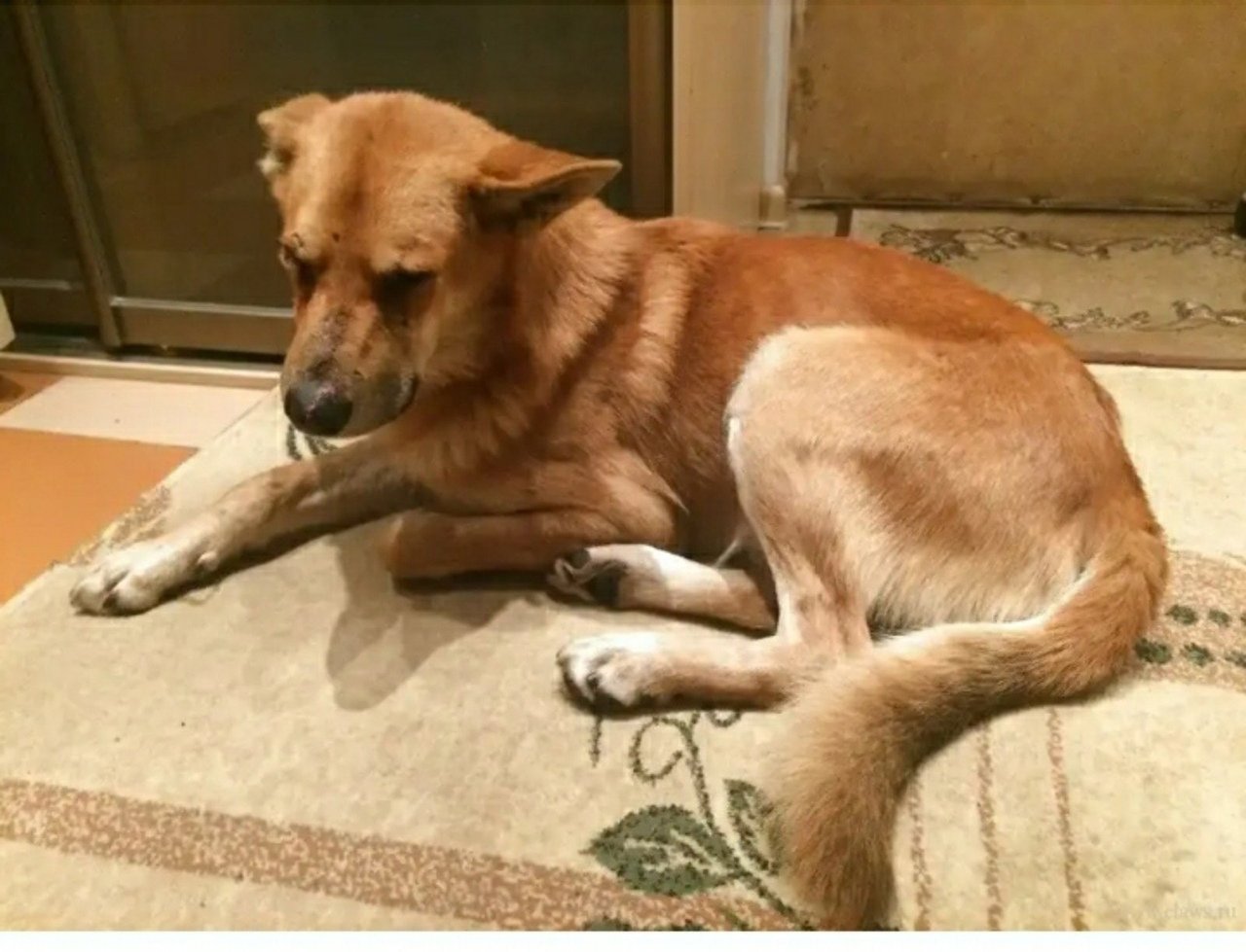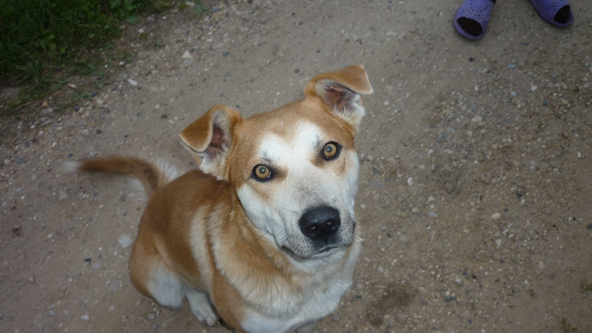 Рыже белая собака дворняжка