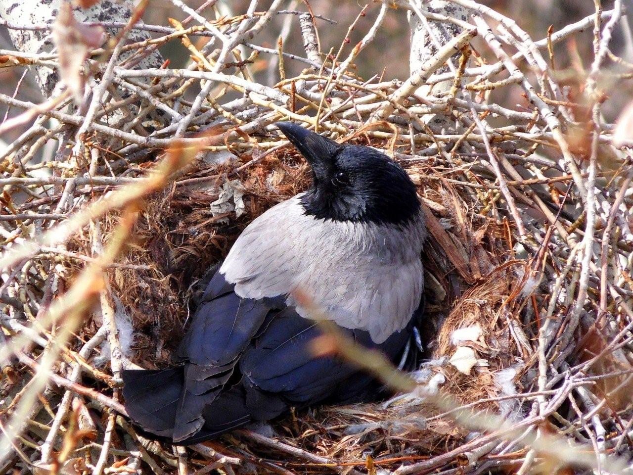 Ворона на гнезде высиживает яйца