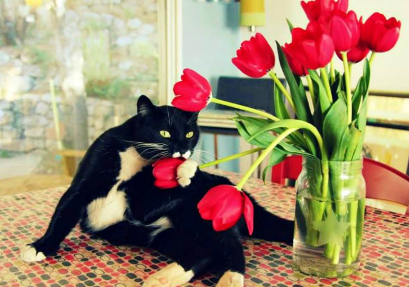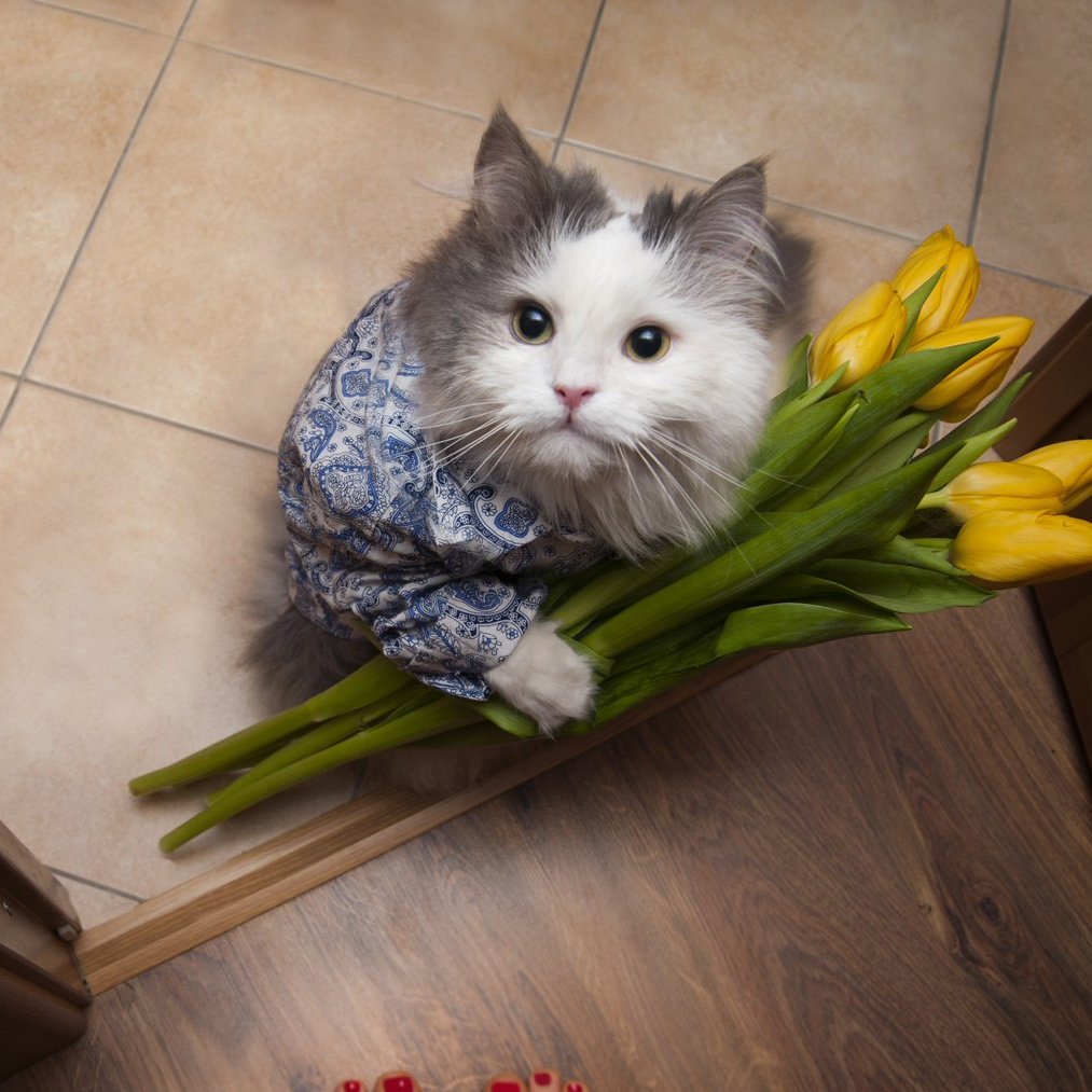 Кот с тюльпанами