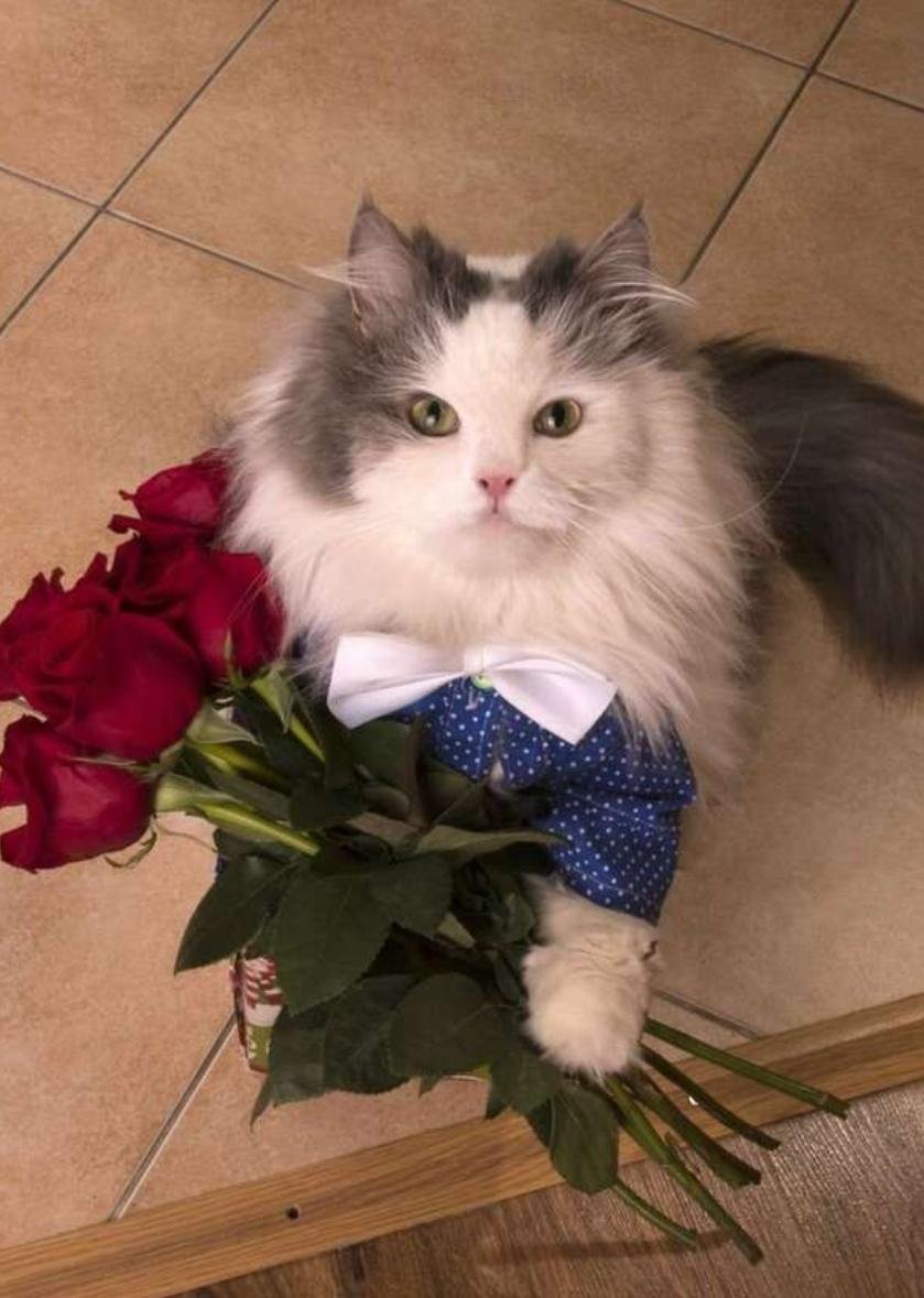 Кот с букетом роз